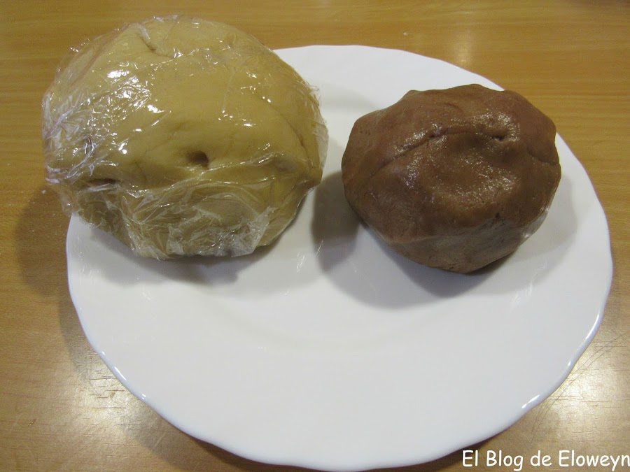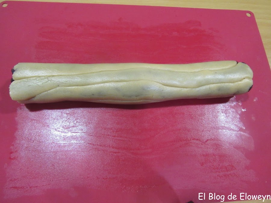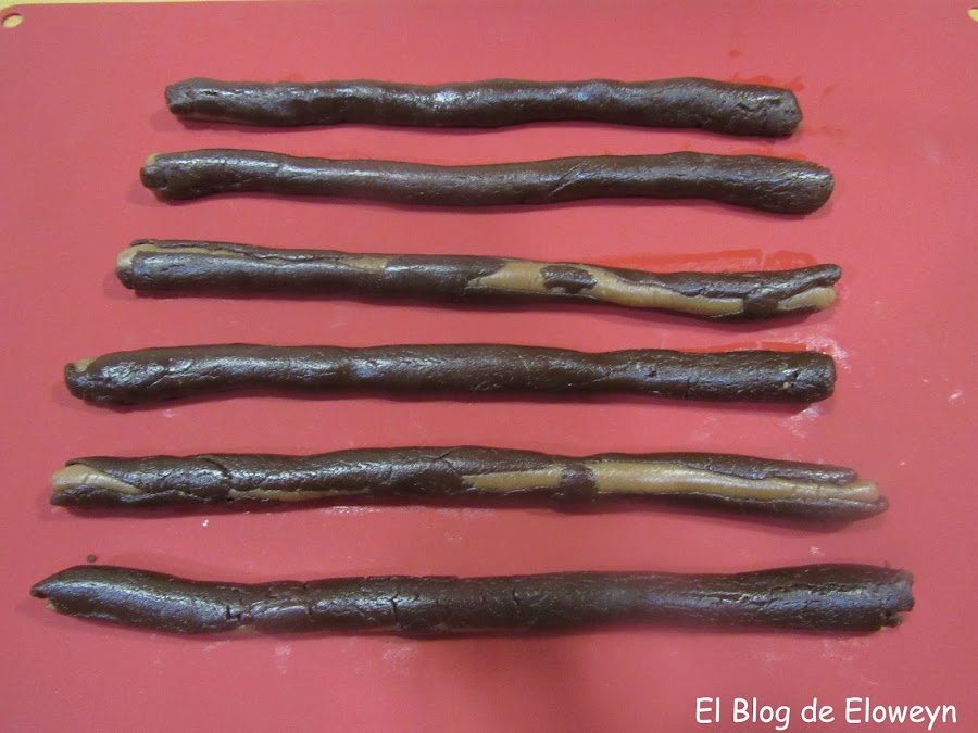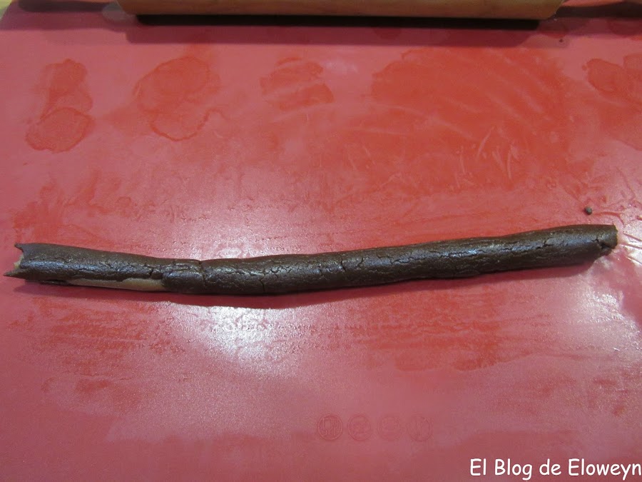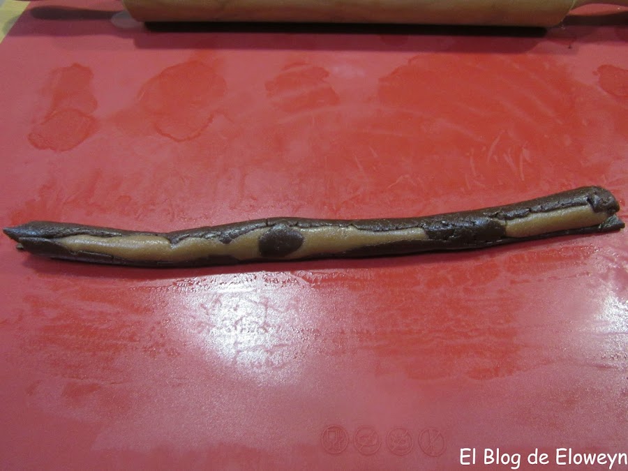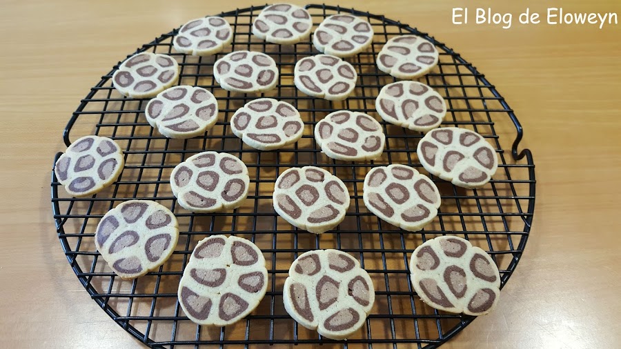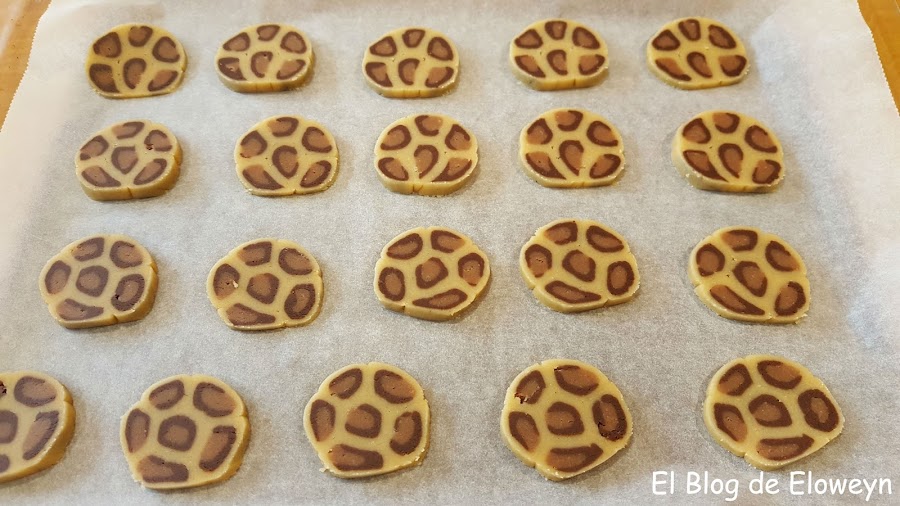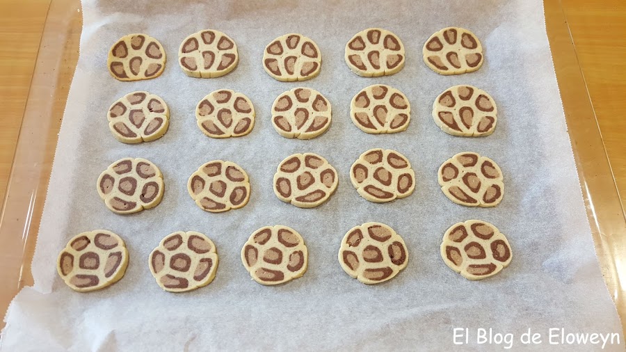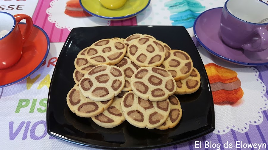 Además, la primera vez que las hice me equivoqué con los colores. Cuando corté aquellas galletas pensé que había algo que no me cuadraba, y cuando saqué las galletas del horno me di cuenta de qué era lo que no estaba bien: La parte más clara estaba bien, pero la parte negra y la marrón estaban cambiadas de lugar: La negra dentro y la marrón fuera... Y yo enviando fotos del corte y del paso a paso del horneado a mis amigas y diciéndoles "Son galletas de leopardo"... y ellas pensando "Qué leopardo tan raro... " jajaja. ¡Anda, que ya me vale! jajaja.