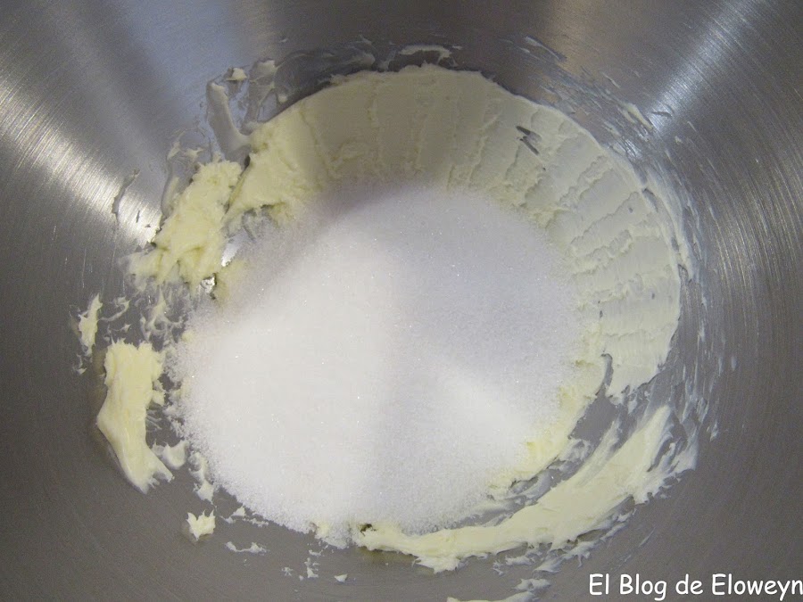 Usamos unas varillas o una batidora con este accesorio (yo usé la KitchenAid) para batir un par de minutos la mantequilla y que se acabe de ablandar. Una vez batida, añadimos los 125 gramos de azúcar.