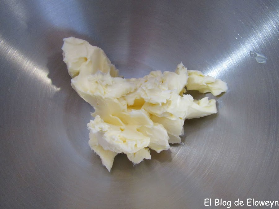A continuación, ponemos en un recipiente los 125 gramos de mantequilla. Como he indicado antes, es muy importante que todos los ingredientes estén a temperatura ambiente.
