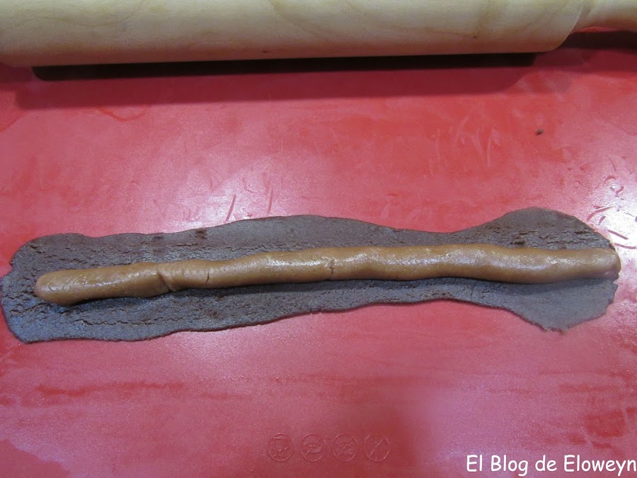 Ponemos uno de los churros sobre la masa más clara y lo envolvemos con ella. Esta vez la masa más clara sí que ha de envolver completamente el churro. No se deben de ver trozos marrones ni negros por fuera.