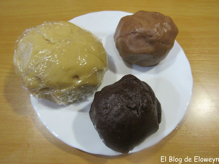 Pesamos la masa. Debe de hacer más o menos unos 680 gramos. Partiremos la masa en tres trozos. El primer trozo ha de pesar más o menos 360. Será la masa para el color más claro. El segundo trozo pesará unos 170 gramos. Será la masa para el color negro. El tercer trozo pesará más o menos 150 gramos. Será la masa para el color marrón. Hacemos 3 bolas y envolvemos en papel film la masa destinada al color más claro.