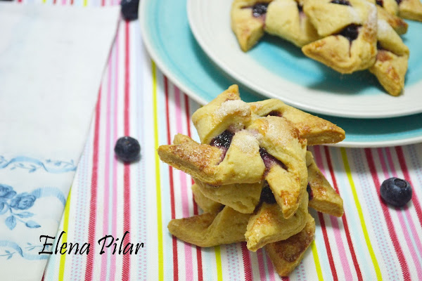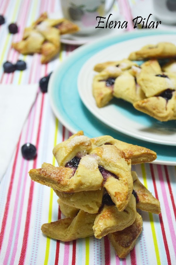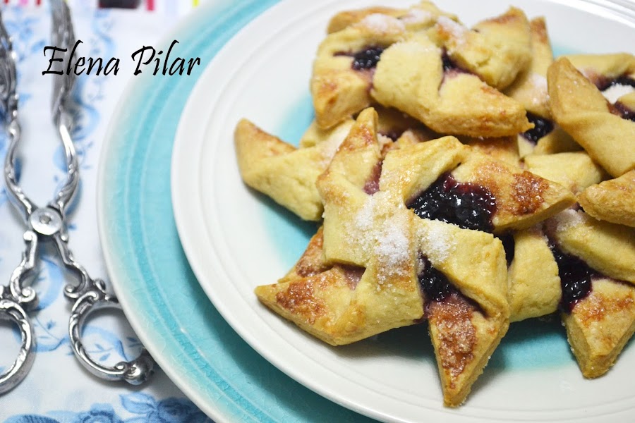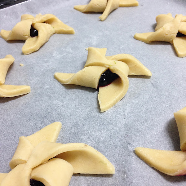 Y la forma es muy sencilla de realizar. Puede que, a primera vista, dé la impresión de que es algo complicado, pero nada más lejos de la realidad. Tan solo tendréis que hacer dividir la masa en ocho cuadrados iguales (de unos 10cm de lado), hacer cuatro cortes en diagonal, desde cada esquina, pero sin llegar al centro, y doblar cuatro puntas de la masa hacia el centro, siempre en la misma dirección. Yo, que soy una auténtica manazas, no he roto ninguna. Así que doy fe de que os saldrán sin problema.