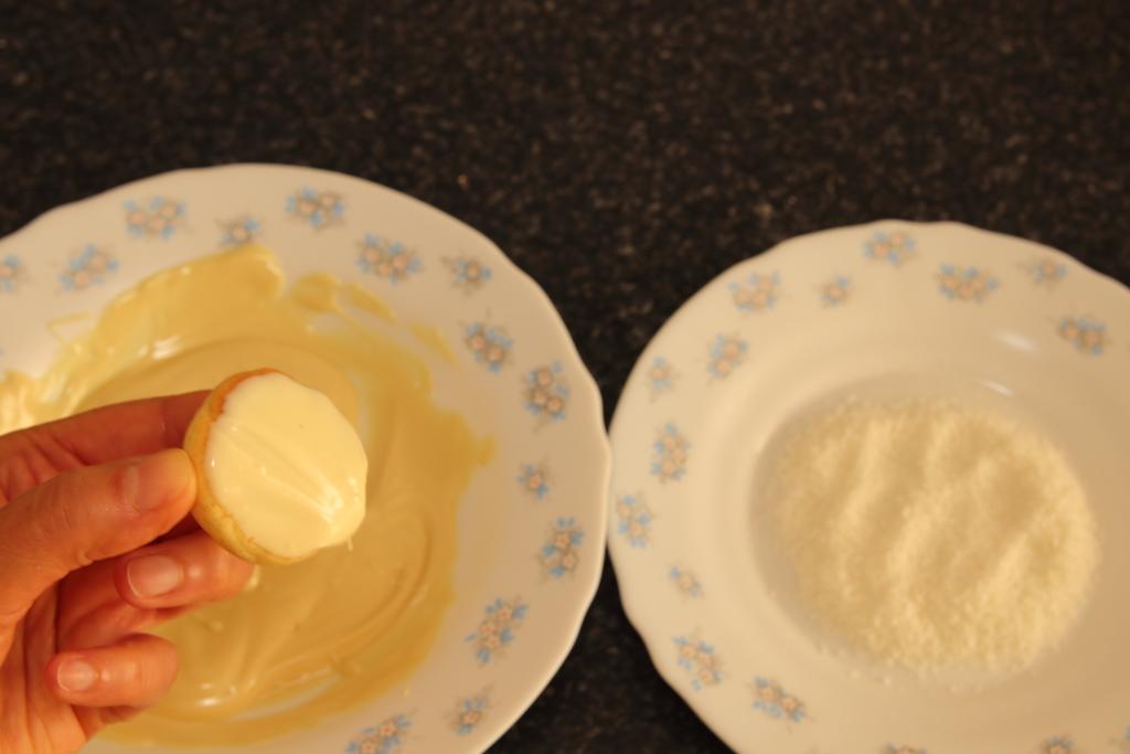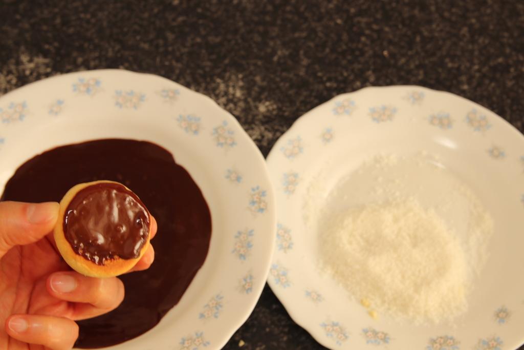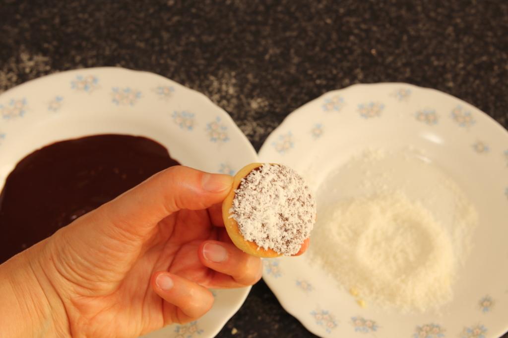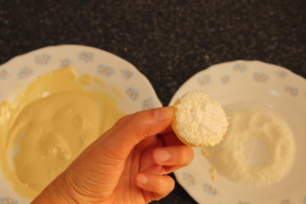 Una vez frías pasamos la base por el chocolate negro o blanco derretidos, por el coco rallado, dejamos secar y…
