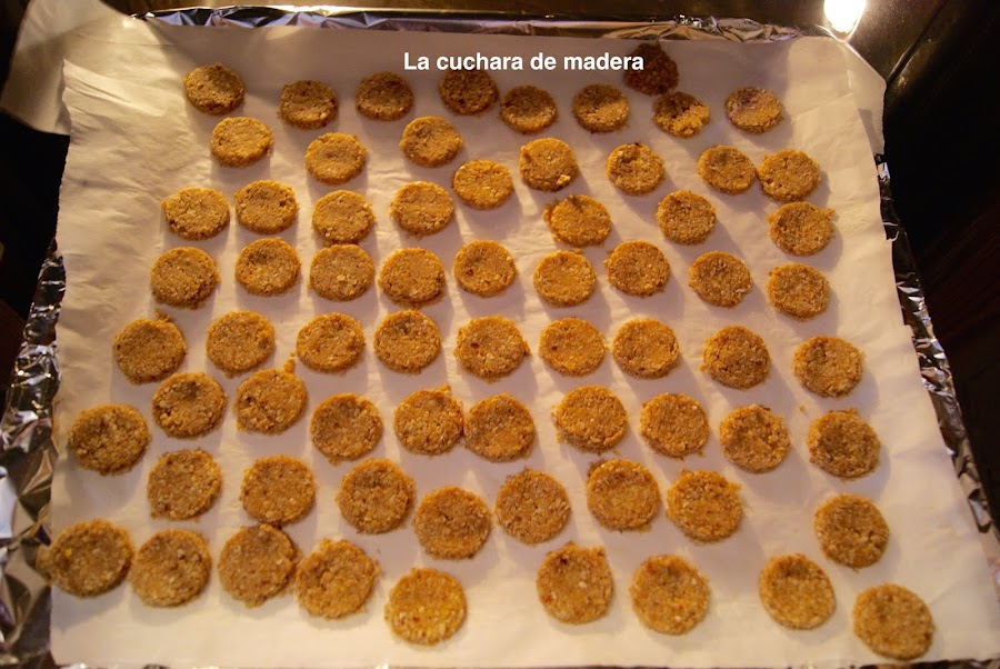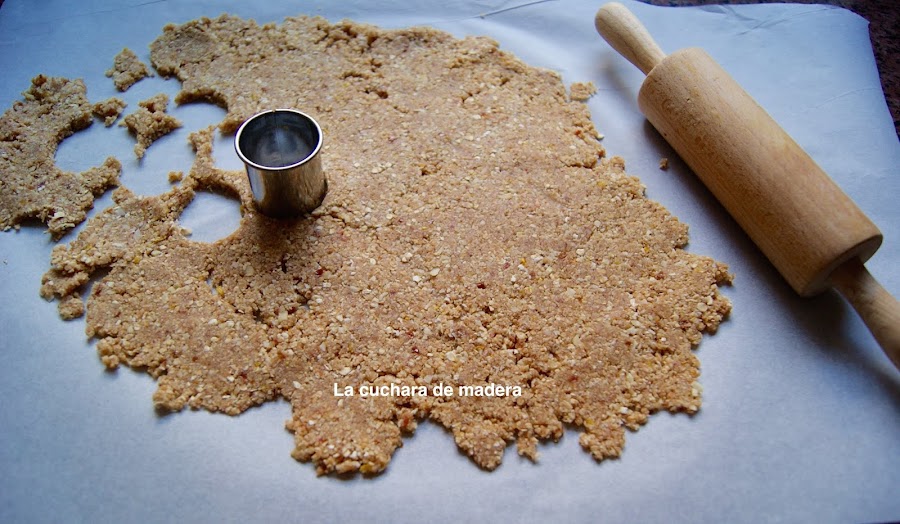 Extendemos la masa poniéndola entre dos hojas de papel de horno y la dejamos lo más fino posible; las cortamos con un corta pasta, el mío era de 4,5 cm de radio. Lo que te sobra lo vuelves a extender