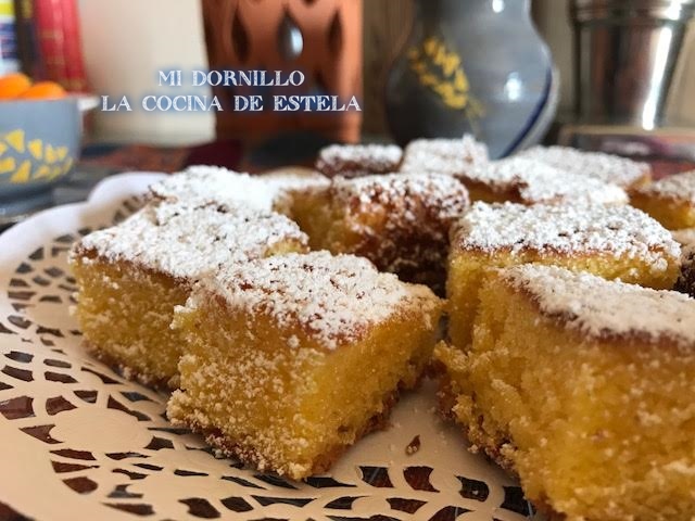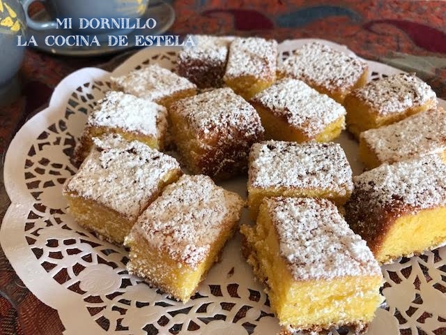 Cuando este lo sacamos y esperamos enfrié, desmoldar en una rejilla y cortarlo en trozos cuadrados y espolvorear con azúcar en polvo.