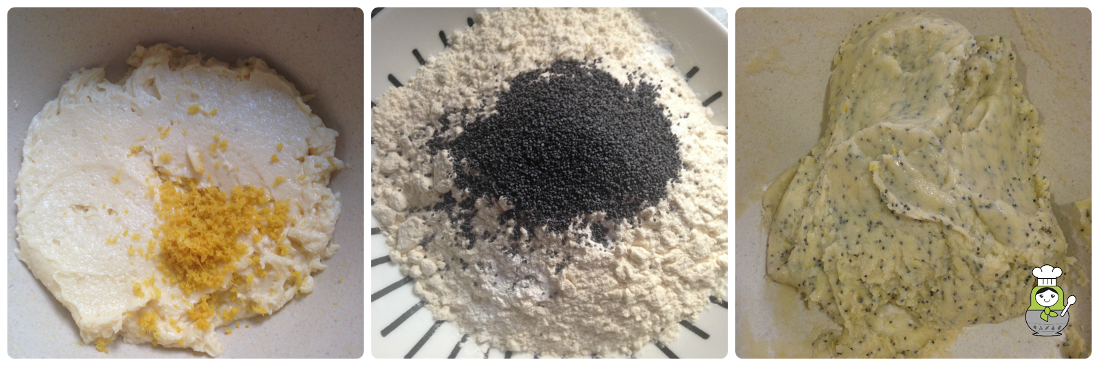 En un bol, mezclamos la harina, la pizca de sal, la levadura y las semillas de amapola. Mezclamos la mantequilla con la harina y amasamos hasta obtener una masa homogénea. Formamos una bola con la masa, la envolvemos en papel film y la dejamos reposar en el frigorífico por un mínimo de 2 horas.