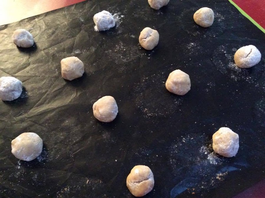 Con una cuchara de té, iremos tomando porciones de masa más o menos iguales y formaremos bolas rebozándolas en el azúcar glass. La masa es muy pringosa, así que se nos pegará a los dedos, de todos modos, con el azúcar, podremos ir formando las bolas. Lo que he hecho es soltar el pedazo de masa sobre el recipiente con azúcar glass y moverlo hasta que se embadurnara bien para poder bolearlo con las manos sin que se pegue.