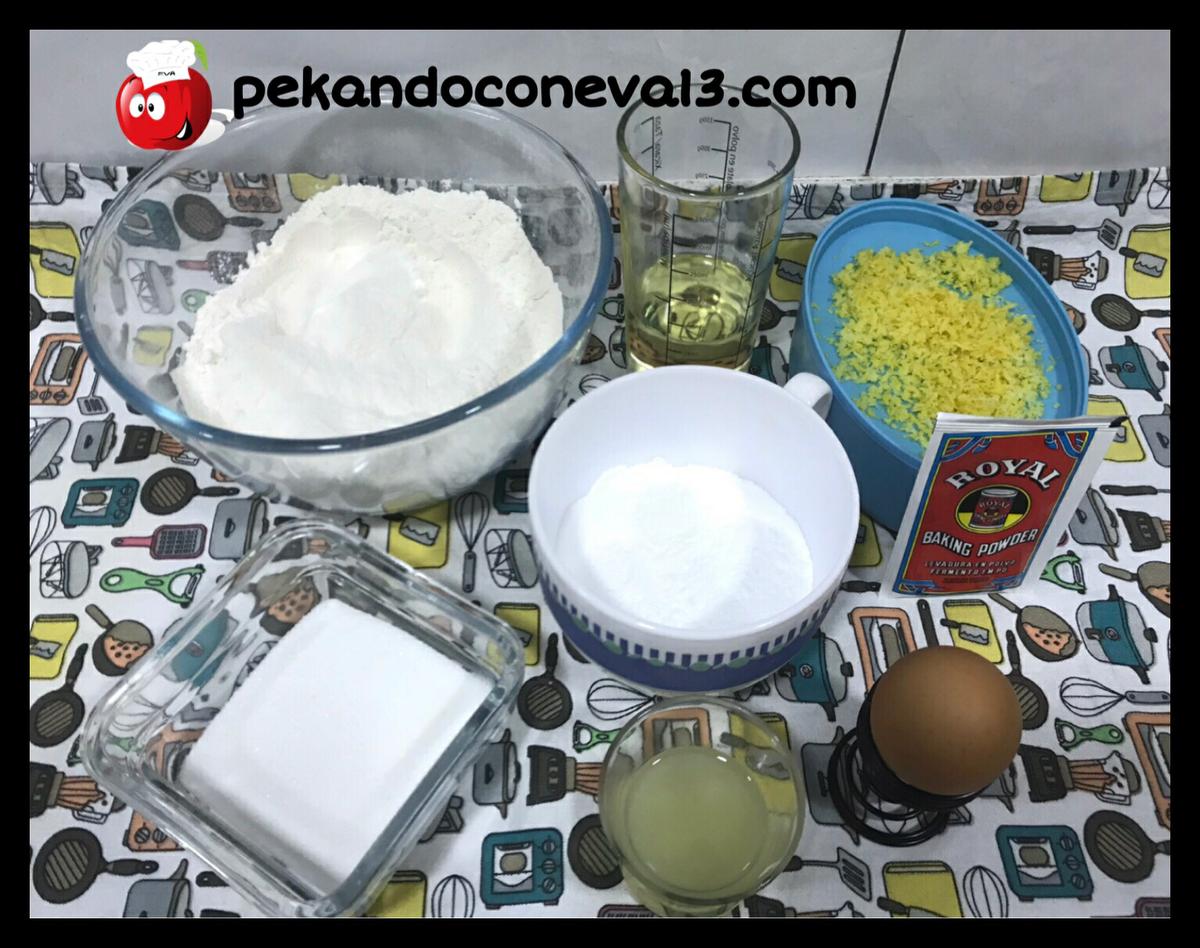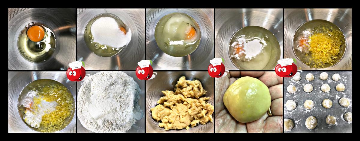 1 huevo, el azúcar, el aceite, el sobre de levadura, la piel rallada del limón, el zumo, la harina previamente tamizada, empezar a batir poco a poco para que la harina no se salga y luego subir la velocidad, cuando la masa os quede como en la foto empezar a amasar y a hacer bolitas y rebozarlas en el azúcar glass, ponerlas en una bandeja en la que hayáis puesto papel de horno y hornear a 180º 20 minutos ( ya sé que soy pesada y siempre lo digo pero cada horno es un mundo así que ir vigilando.)
