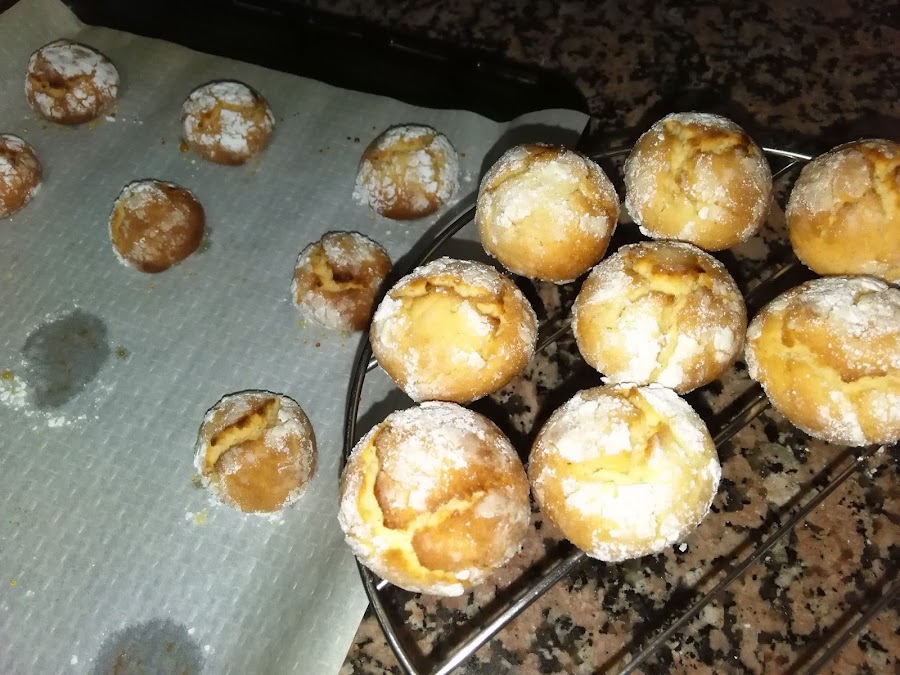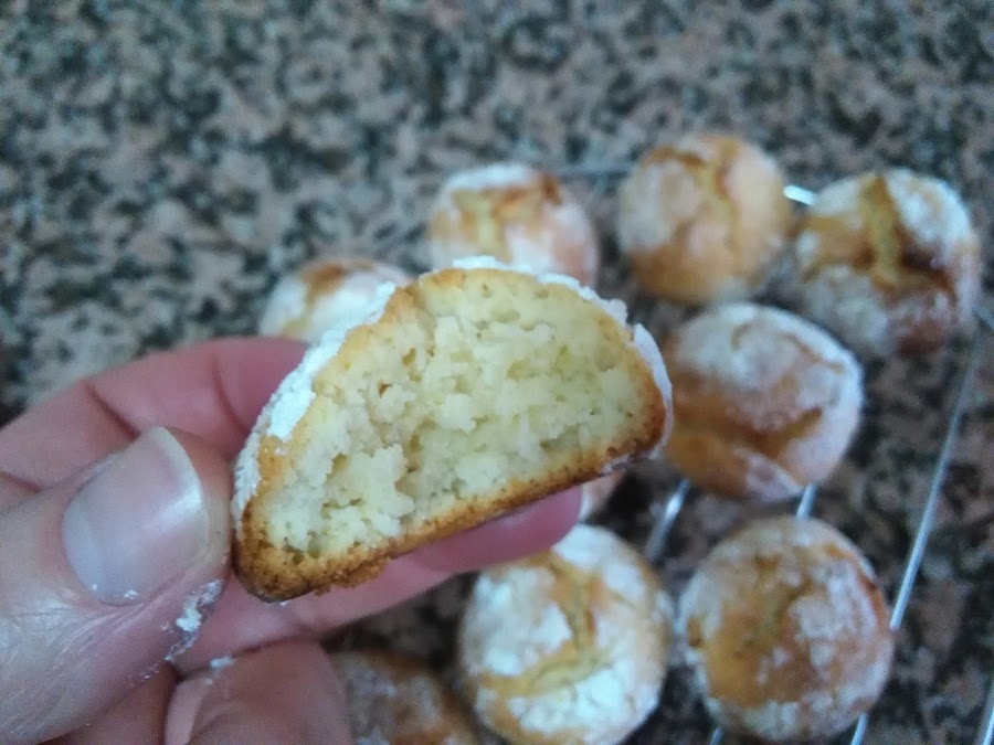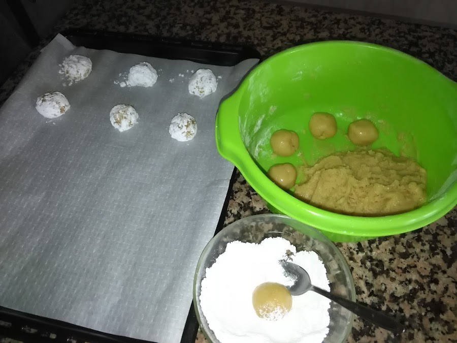 Cuando la masa se una, se acaba de trabajar con las manos, se forman bolas y se pasan por el azúcar glass, se van colocando en un molde, mejor poner papel de horno debajo
