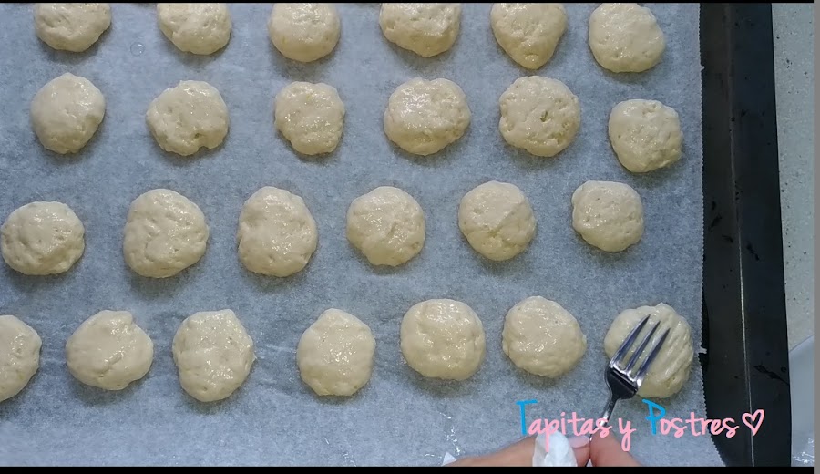 Cogemos porciones con la mano, hacemos bolitas y aplastamos un poco. Las colocamos en una bandeja de horno. Las marcamos ligeramente con un tenedor y le ponemos encima ralladura de limón.