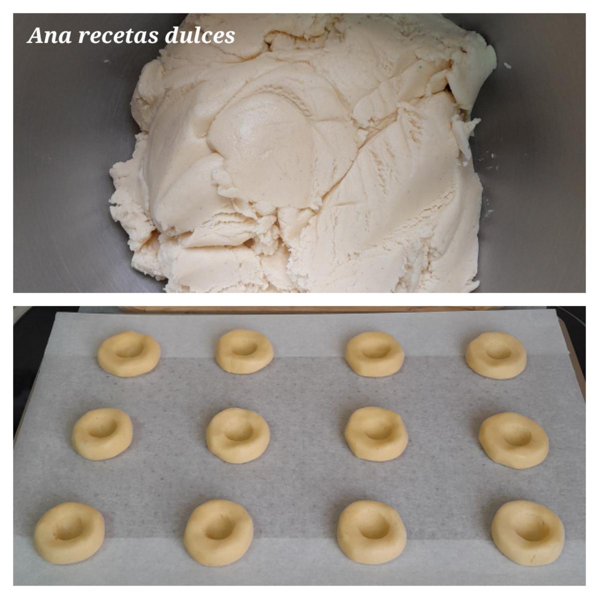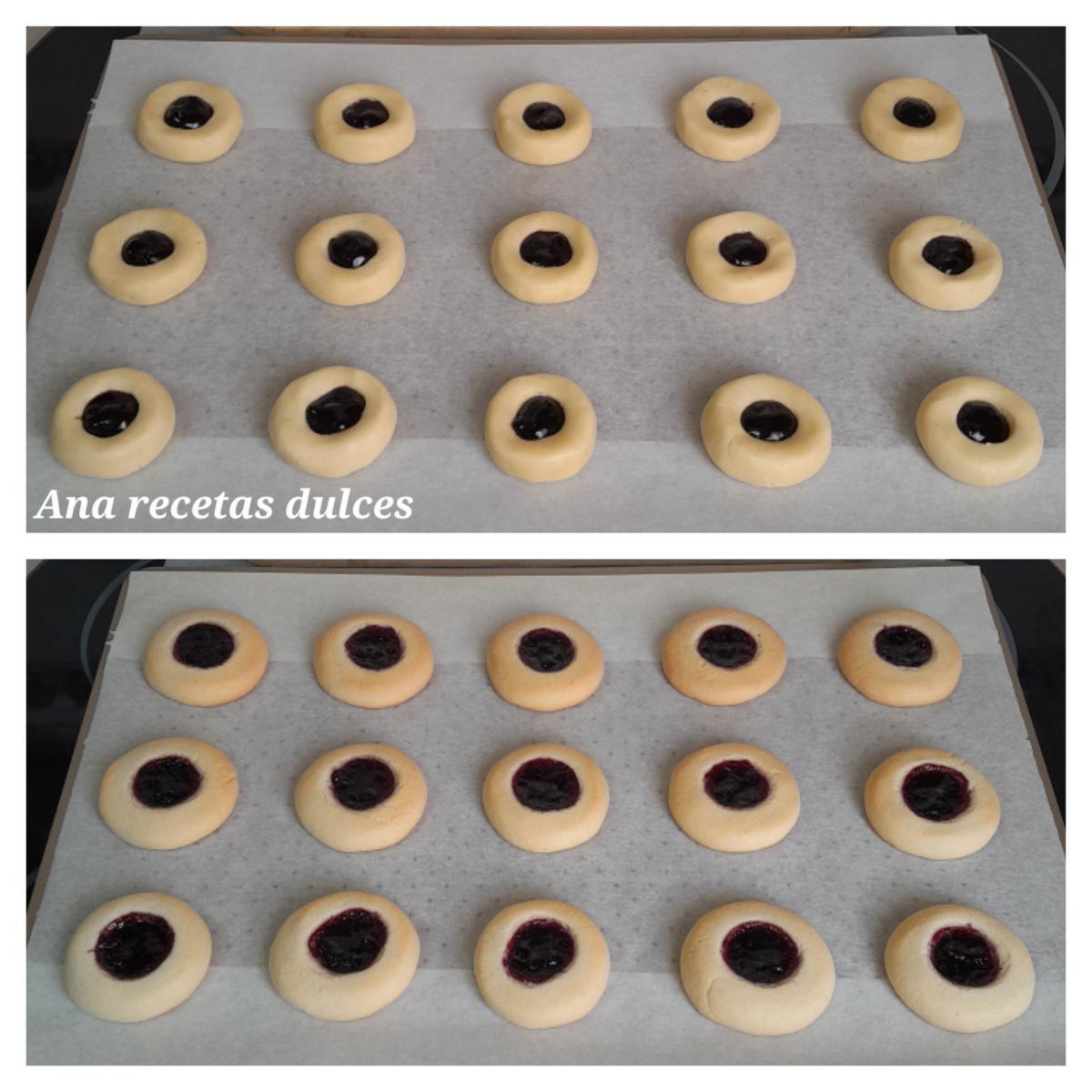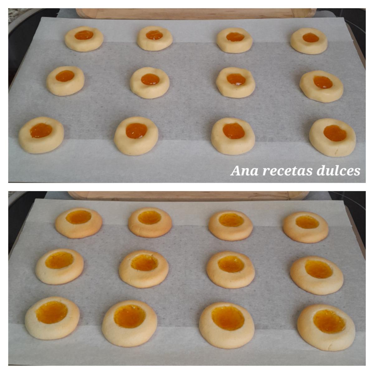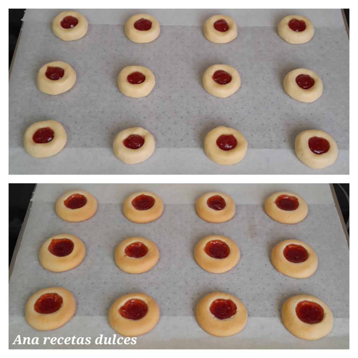Pasado el tiempo, sacamos la masa de la nevera y hacemos bolas de 22 gramos, las aplastamos un poco y las colocamos en una bandeja de horno forrada con papel de hornear, separadas entre ellas unos centímetros, con el mango de una cuchara de madera o cualquier utensilio con el mango redondo, presionamos justo en el centro de las galletas para hacer un hueco, rellenamos los huecos con mermelada de distintos sabores.