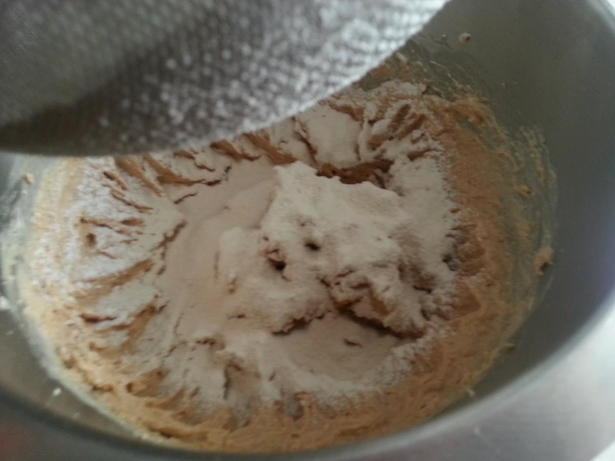 3. - Pasamos la harina junto con el bicarbonato por un colador y la tamizamos sobre la mezcla anterior, y añadimos la sal, y mezclamos con una espátula.