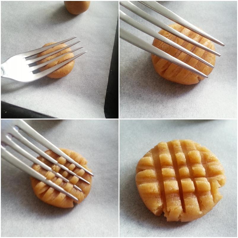 7. - Deben estar separadas, ya que ahora , con un tenedor, las aplastamos con cuidado, para aplanarla un poco, y luego, formando una cruz, volvemos a aplastarlas para que formen unos cuadradados.