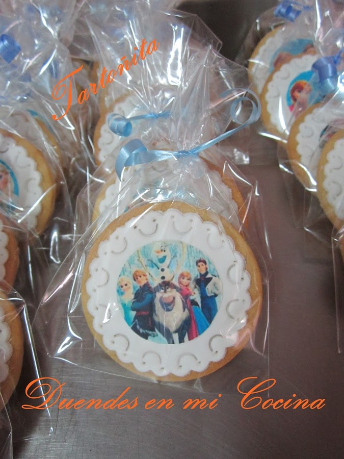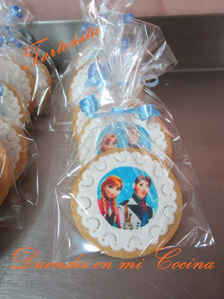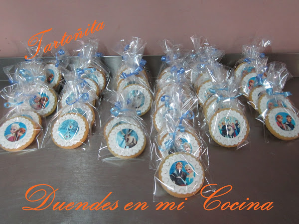 Acompañada de su tarta, que ahora os enseño, nos pidieron estas galletas decoradas con dibujos variados de Frozen.