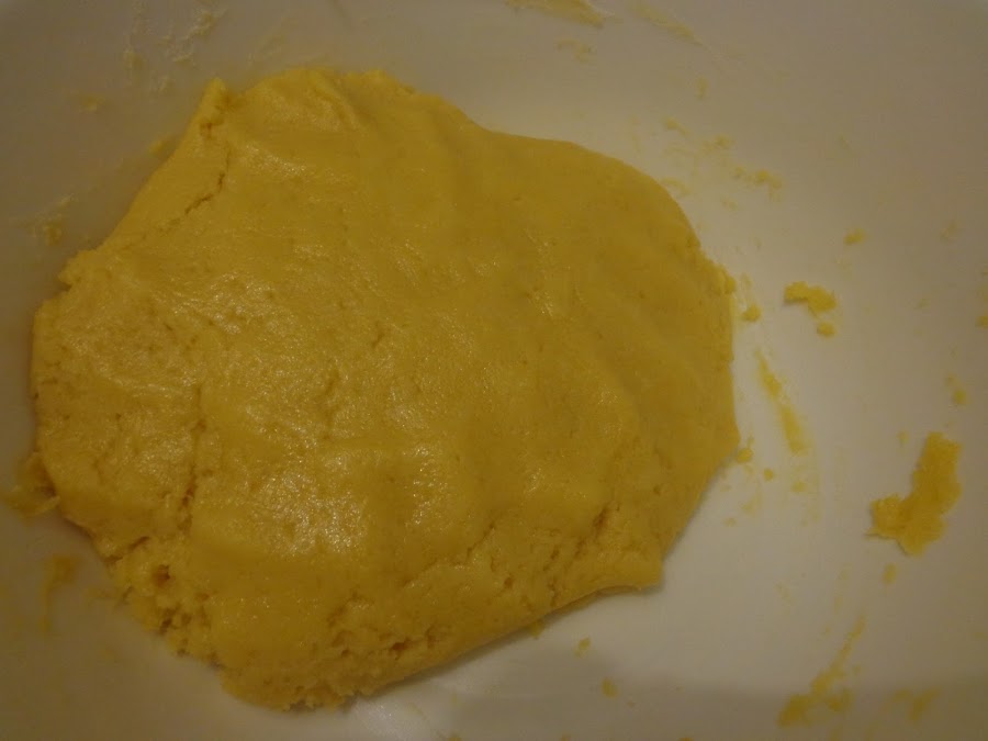 Ponemos en un bol la mantequilla un poco blanda con el azúcar y vamos moviendo hasta que parezca una suave crema. Luego le añadimos la harina tamizada y volvemos a mezclar bien, y por último le añadimos la esencia.