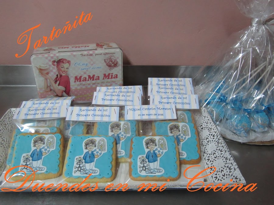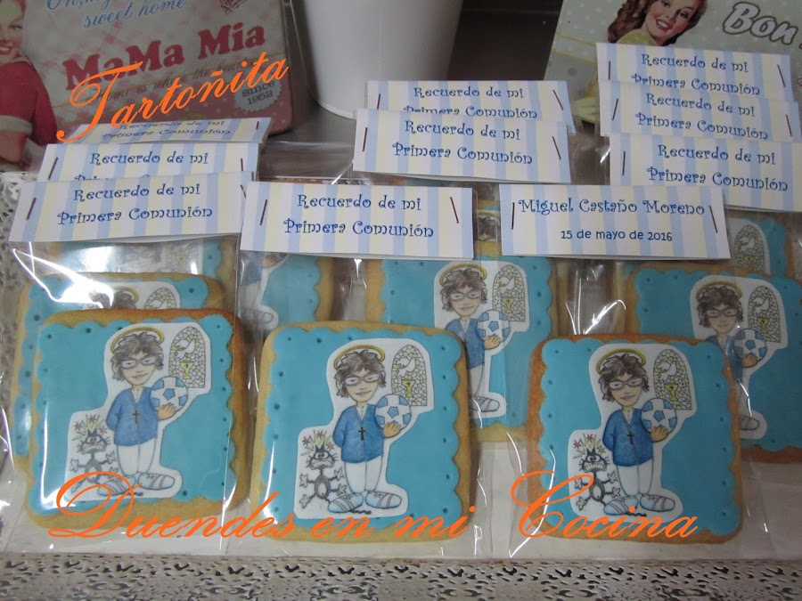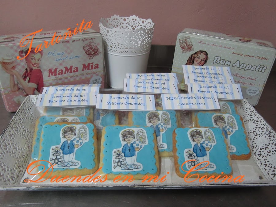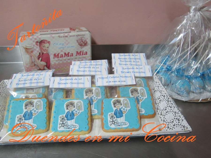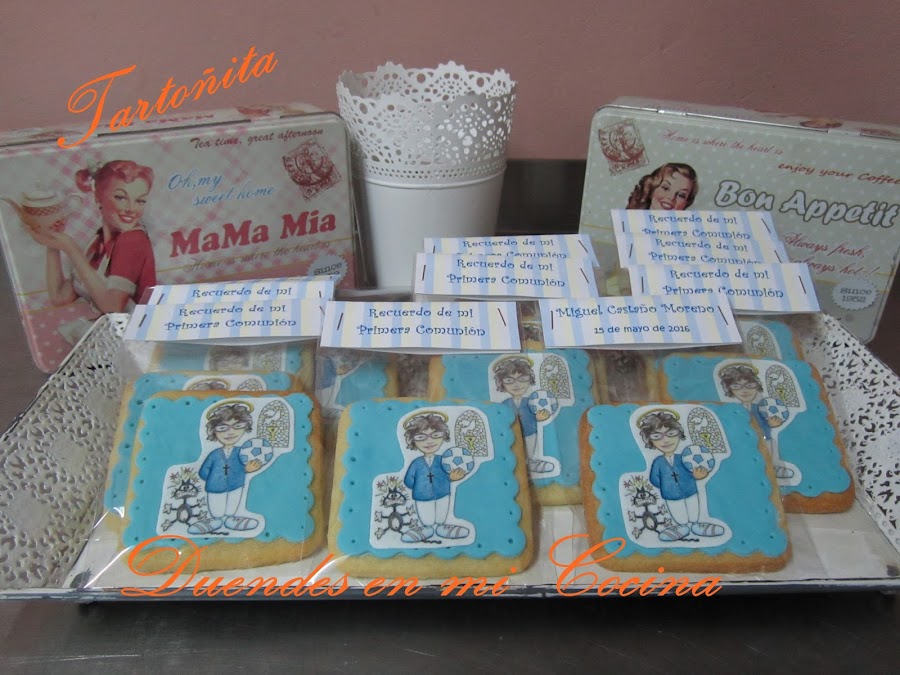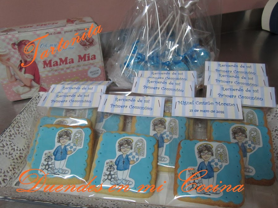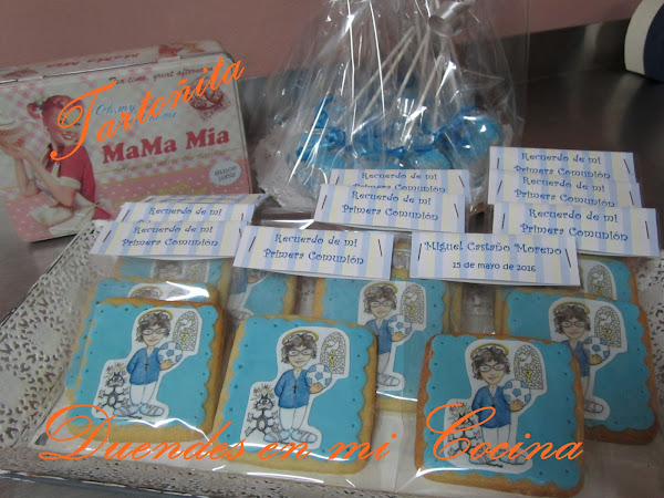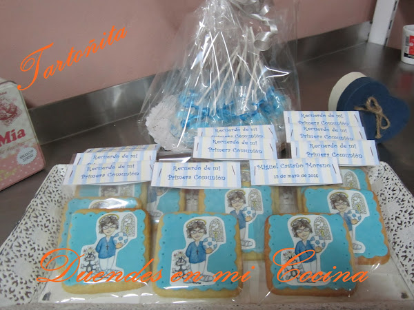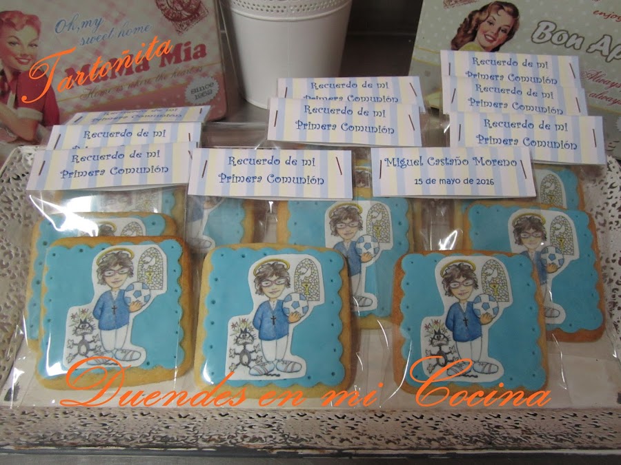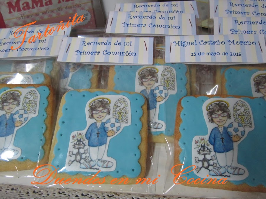 Otro trabajo realizado para una comunión, la comunión de Miguel, realizadas con galletas de mantequilla y la decoración sobre fondo de fondant una imagen a gusto de Miguel vestido de comunión realizada en papel de azúcar.