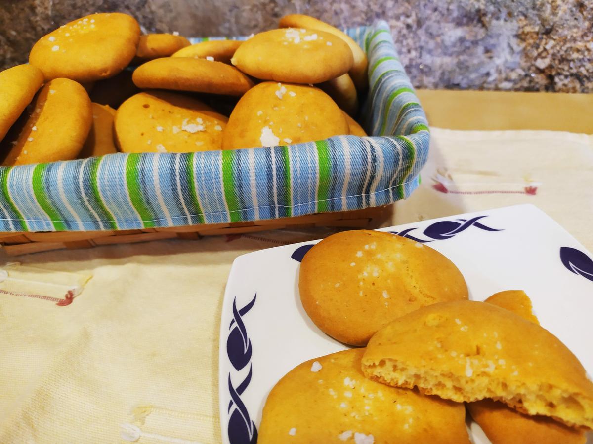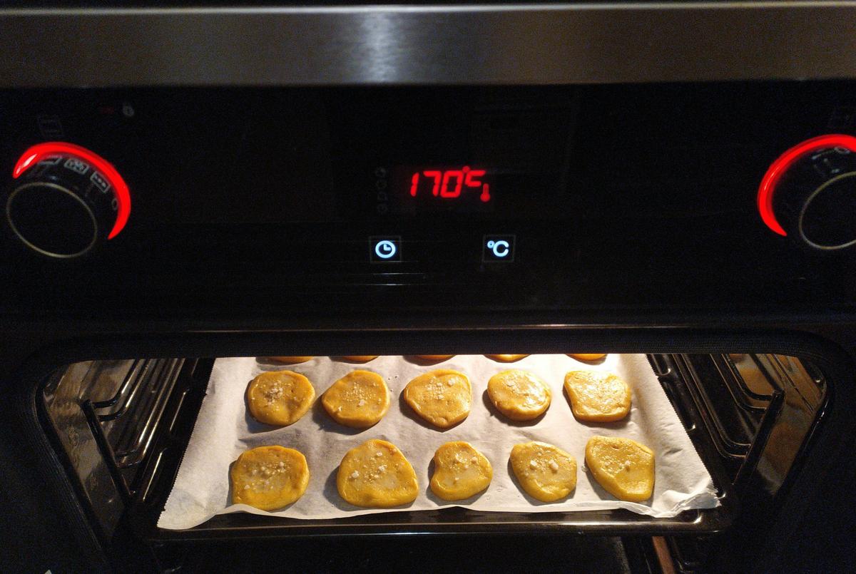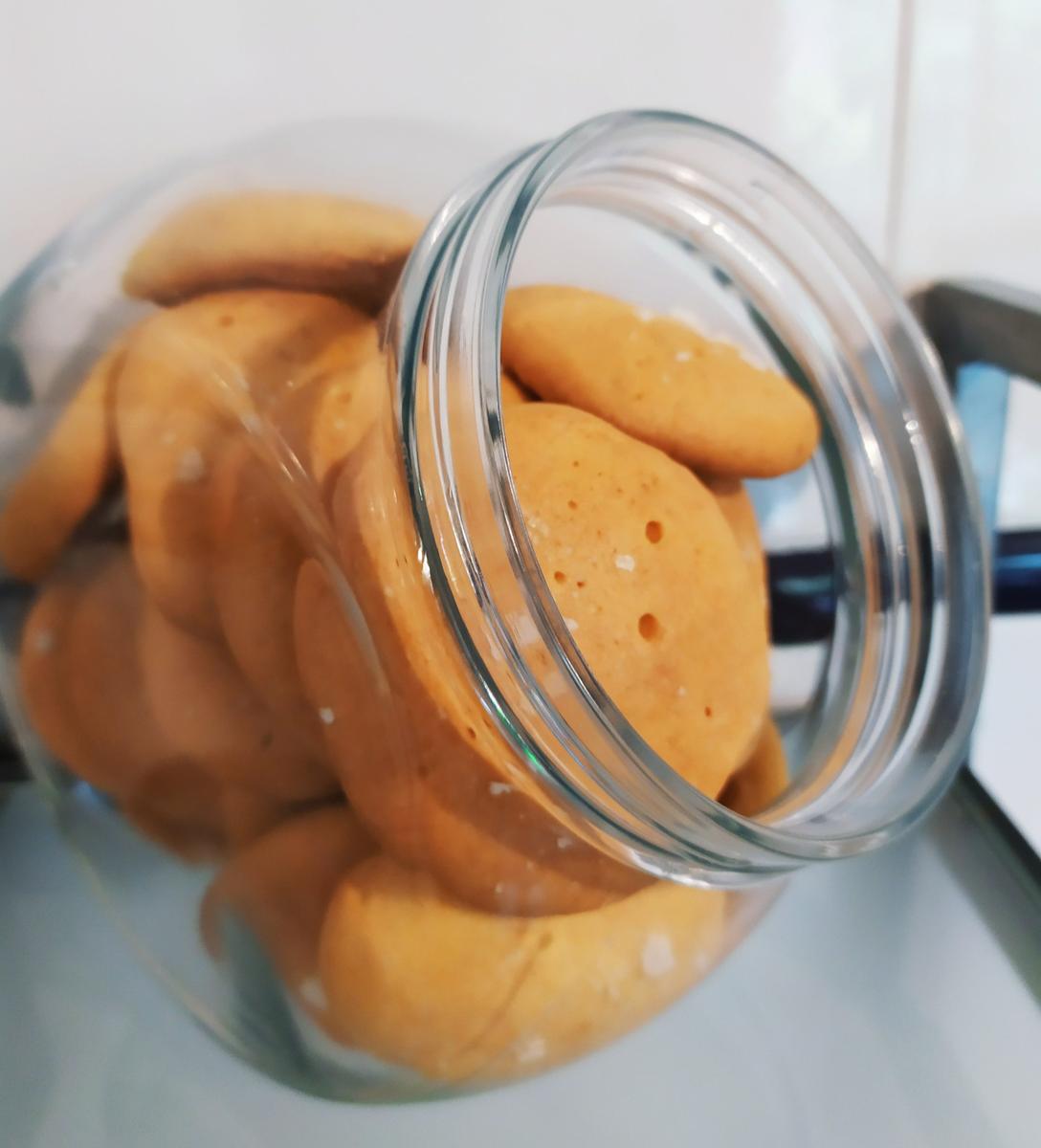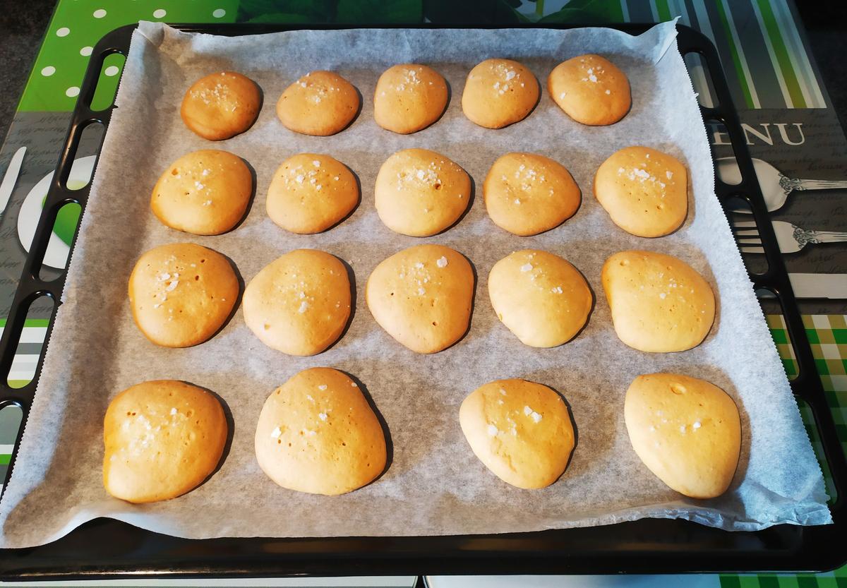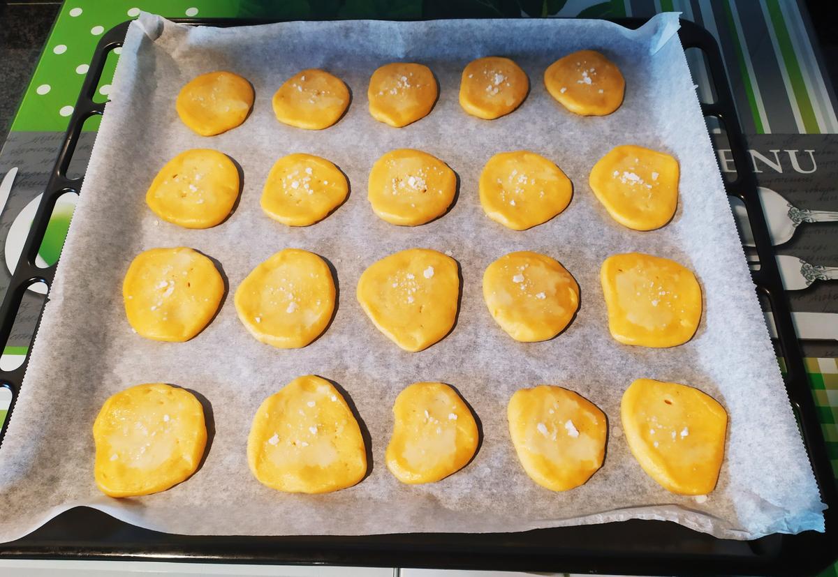 Quitamos el papel film y cortamos rodajas como de un centímetro de espesor, las aplanamos un poquito con la mano y las vamos colocando en la bandeja sobre papel de hornear, humedecemos ligeramente la superficie de las galletas y les pegamos algunas escamas de sal. El horno lo tendremos precalentado a 170º