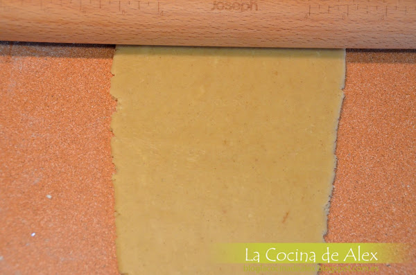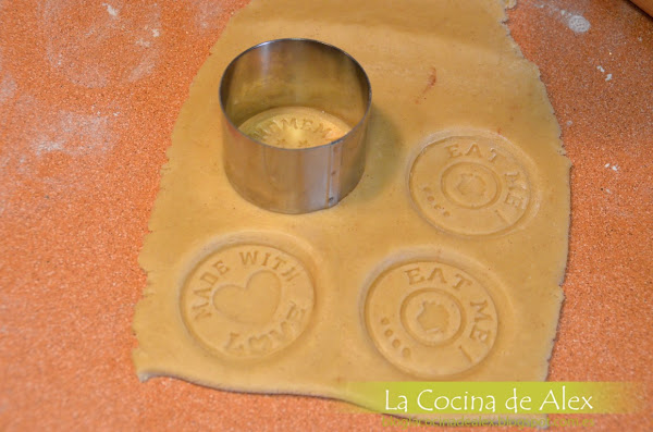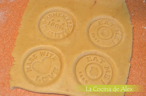 Sobre la mesa con un poco de harina, estiramos las masas con un rodillo hasta que tenga un grosor de unos 6-8mm. Y vamos marcando las galletas con los sellos, previamente bañados con harina para que no se pegue la masa. Finalmente cortamos con la ayuda de un cortapastas para darle la forma de galleta.