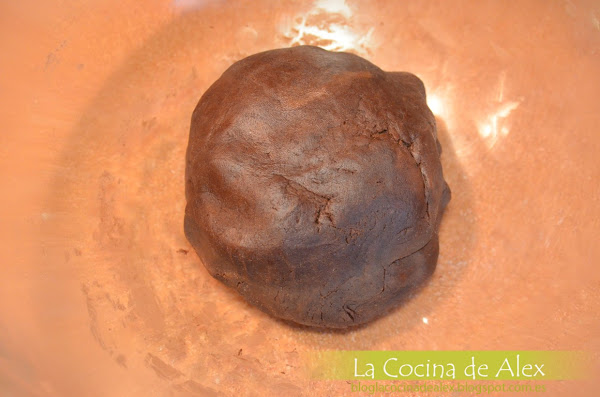 Separa la harina sobrante en dos partes (175gr y 150gr). Tamizar los 175gr en un bol y los 150gr junto con el cacao (25gr) en el otro bol. Mezclar ambas masas hasta que tomen un color homogéneo. Envolver con papel film y dejar reposar en el frigorífico durante un mínimo de 1 hora, si es mas tiempo mucho mejor.