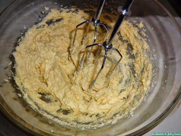 Batimos en un bol la mantequilla en pomada junto con las dos clases de azúcar. Removemos hasta que estén los ingredientes bien integrados.