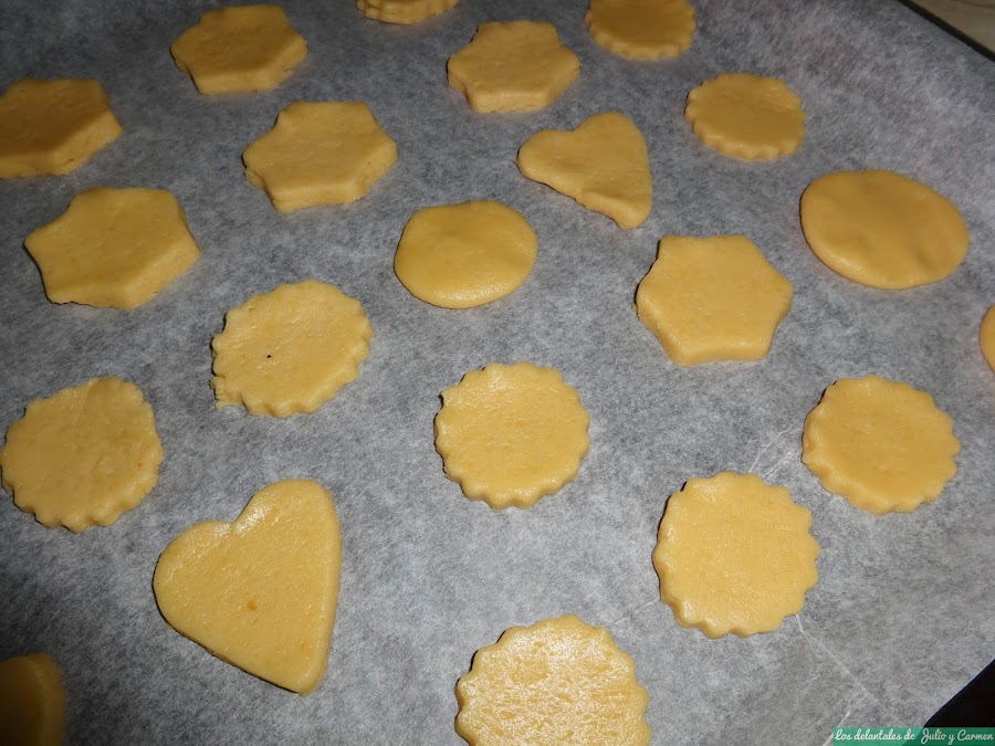 Lo sacamos pasado el tiempo y extendemos las masa, después de volver a amasar un poco, sobre la encimera. Con moldes partimos las galletas sin que sean muy gruesas (sobre 1/2 cm mas o menos) y las disponemos en una bandeja de horno con papel vegetal.