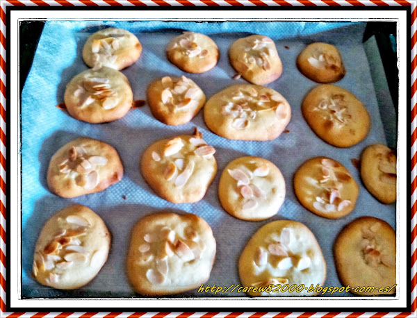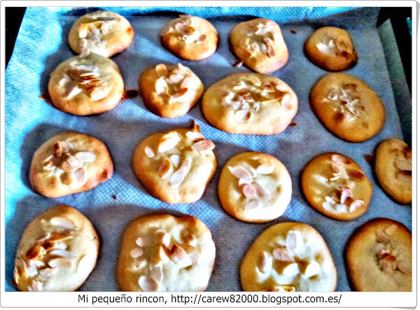 Precalentamos el horno a 200 grados y ponemos en una bandeja papel especial de horno y vamos haciendo bolitas con la masa y las colocamos en la bandeja aplastándolas más o menos a 1 cm de grosor, si vemos que la masa se nos pega nos untamos las manos con un poco de aceite, esto nos ayudara a formar las galletas, una vez terminada todo la masa decoramos con la almendra laminada y metemos las galletas a hornear, hasta que comiencen a dorarse, las sacamos y dejamos reposar.