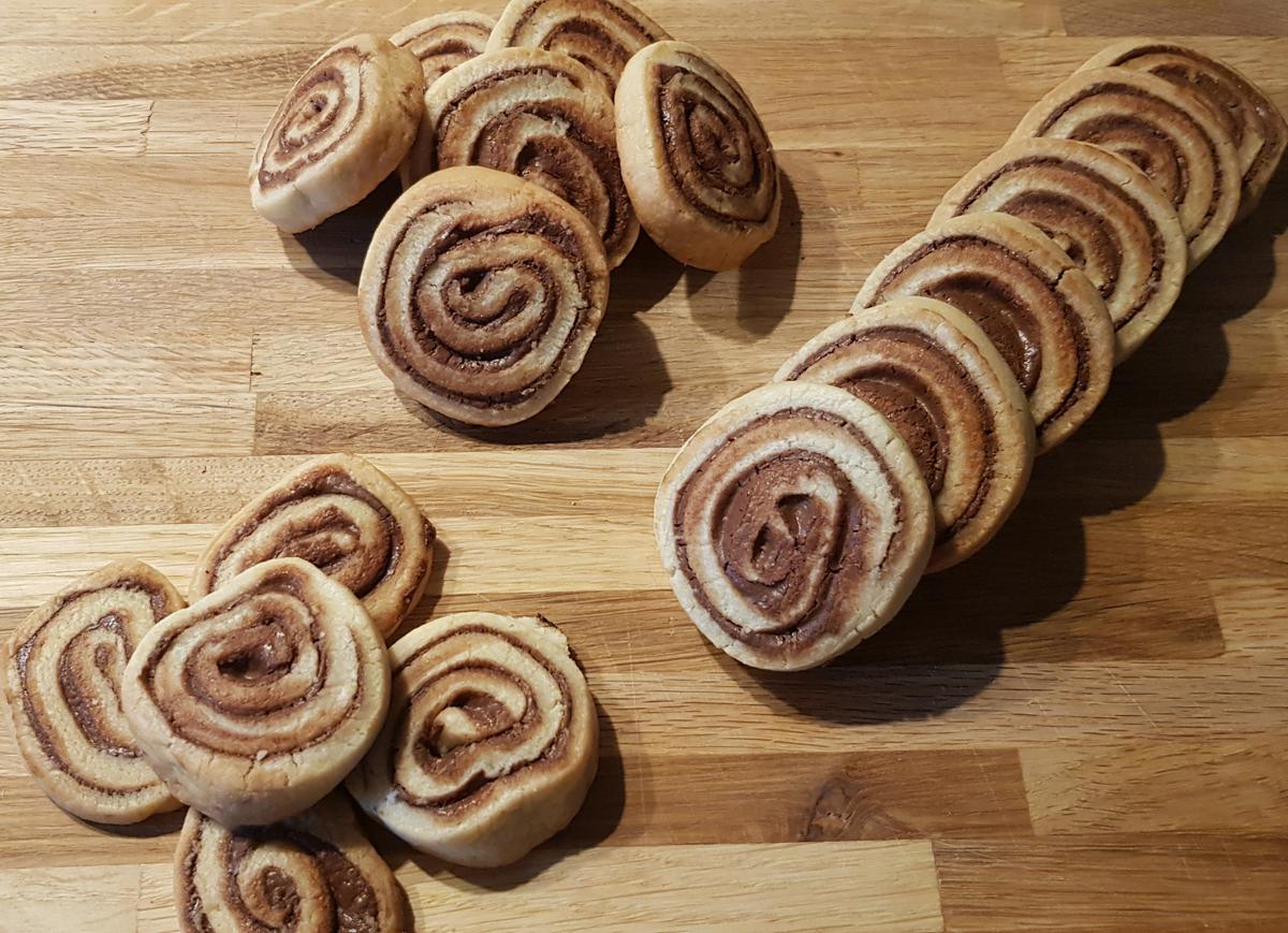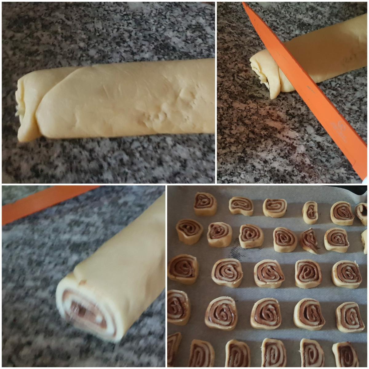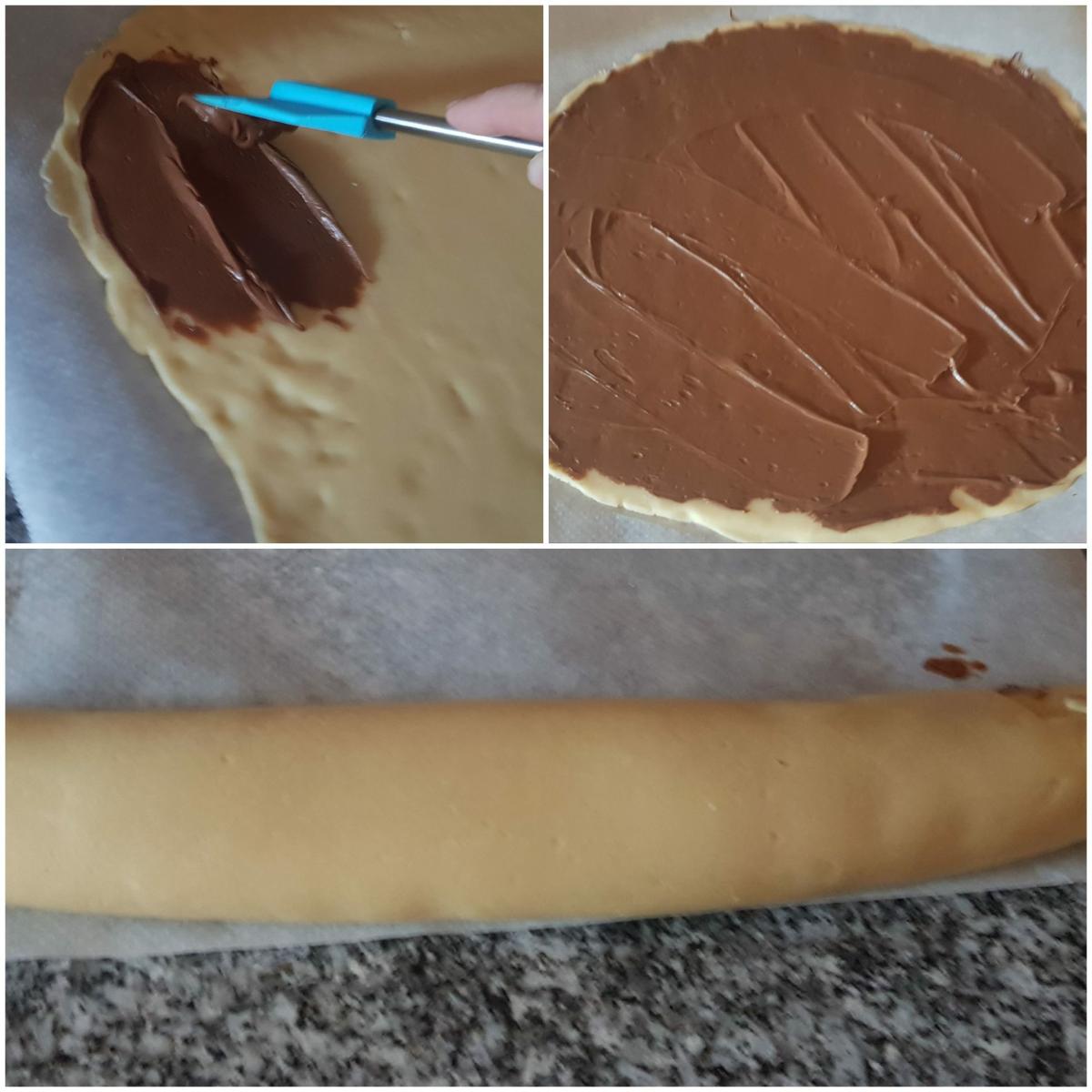 Untar la crema de avellanas Con la ayuda de una espátula o un cuchillo untaremos toda la superficie de la masa con la crema de avellanas, yo en mi caso, nocilla, y empezaremos a enrollarlo desde una extremidad, con cuidado, para que no se rompa, hasta que quede en forma de rollo.