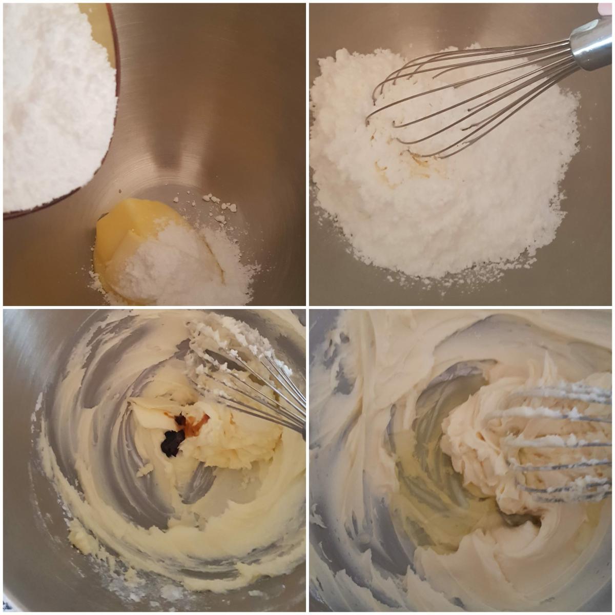 Mezclamos ingredientes En un bol introducimos, la mantequilla con el azúcar glas, y batimos bien con unas varillas hasta que se integren bien los ingredientes. Después incorporamos la esencia y la clara de huevo, y seguimos mezclando.