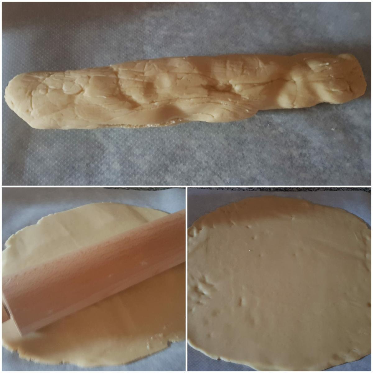 Amasar Una vez pasado el tiempo de refrigeración, ponemos nuestra masa encima de un papel de horno y lo amasamos con la ayuda de un rodillo, intentando dejarlo de forma rectangular y como de 1 centímetro de grosor.