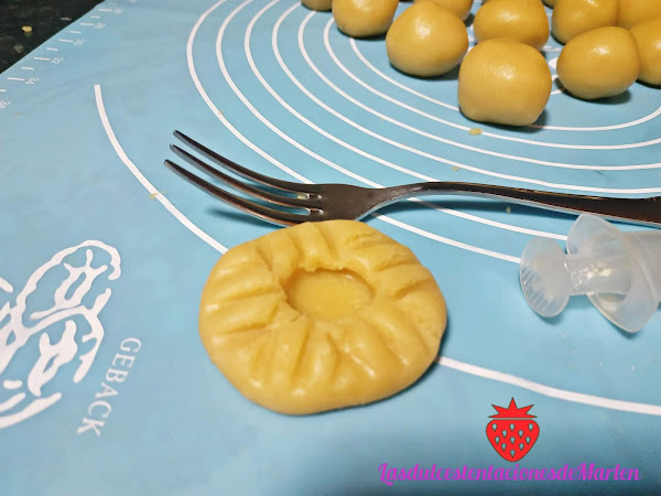 Una vez hechas, las pasamos a la bandeja del horno que tendremos cubierta con papel sulfurizado. Las vamos rellenando con la mermelada. (yo les he puesto de fresa y melocotón).