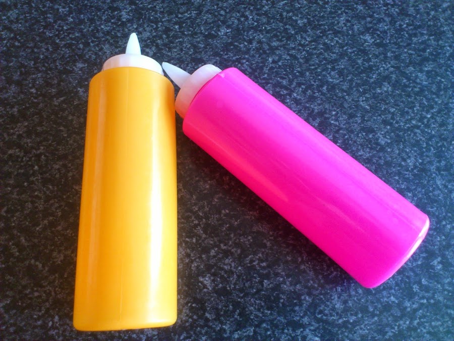 Para hacer el glassé: mezclamos el huevo batido y el azúcar glassé, lo batimos con las varillas y los separamos en varios cuencos, según los colores que queremos hacer y echamos los colorantes. El glassé los pongo en unos dosificadores que encontré en las tiendas de chinos, que me van muy bien.
