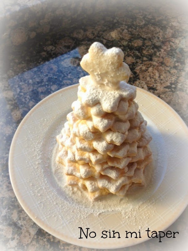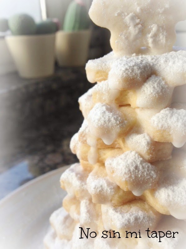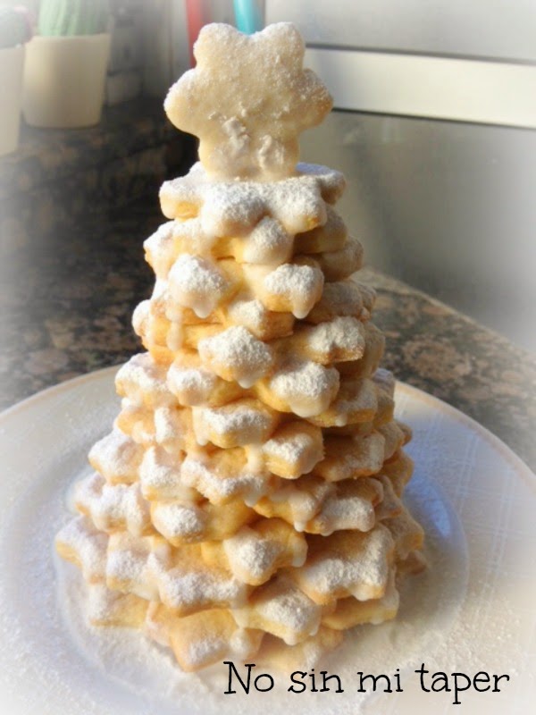 Esta vez Nicolás quería hacer algo navideño, así que el trabajo duro fue suyo. Las galletas, las de siempre, esta vez en forma de estrellas de diferentes tamaños pegadas con glasa real unas sobre otras para formar un abeto de navidad. Para decorar, azúcar glas mezclado con purpurina comestible. Precioso. Y mi petit chef, orgullosísimo. Y yo, que disfruto un montón con él en la cocina, encantada.