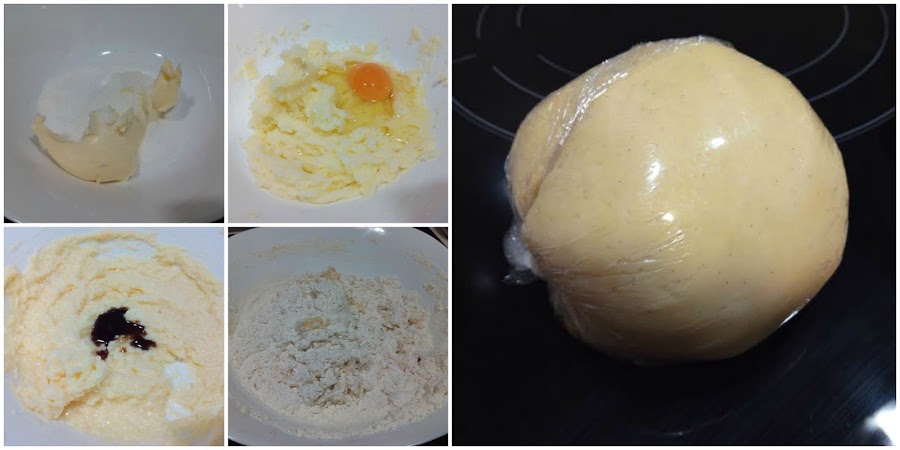 Batimos la mantequilla con el azúcar hasta que blanquee. Añadimos el huevo y cuando esté completamente integrado agregamos 1 cucharadita de aroma de vainilla. Incorporamos la harina, la sal y mezclamos bien. Formamos una bola con la masa y la envolvemos en film transparente. Reservamos en el frigorífico durante un par de horas mínimo.