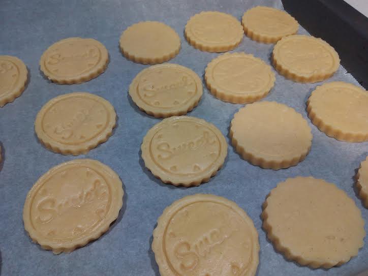 Colocamos la bola de masa entre dos láminas de papel vegetal y extendemos con ayuda de un rodillo dándoles el grosor deseado (mínimo 0,5 cm). Cortamos con ayuda de un corta pastas (para que queden un poco más bonitas las sellamos con los sellos que aparecen en la foto de los ingredientes) y volvemos a meter en el frigo mínimo 1 hora.