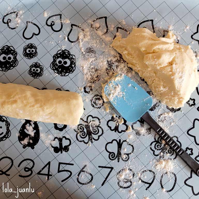Espolvoreamos la superficie de trabajo con un poco de harina y volcamos la masa sobre ella. La cortamos en dos porciones y le damos forma de cilindro, si queremos que nos salgan unas galletas redondas, o en forma de cubo si las queremos cuadradas. Envolvemos en papel de film y reservamos en el frigorífico al menos durante media hora.