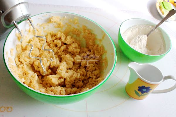 Añadiremos poco a poco la harina, y batiremos para que se integre en la masa. Cuando más o menos llevemos la mitad de la harina incorporada, la masa se verá muy quebrada, tal y como os muestro en la imagen.