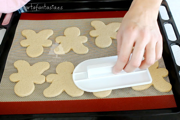 Elegiremos un cortante que más nos guste y cortaremos las placas de galletas, retirando el papel de horno superior, rápidamente pondremos las galletas sobre una bandeja de horno, si tenemos tapete de silicona lo pondremos en la bandeja de horno y las galletas encima. Debemos trabajar rápido porque cuanto más se caliente la masa, más difícil será cortar las galletas y ponerlas en la bandeja de horneado.