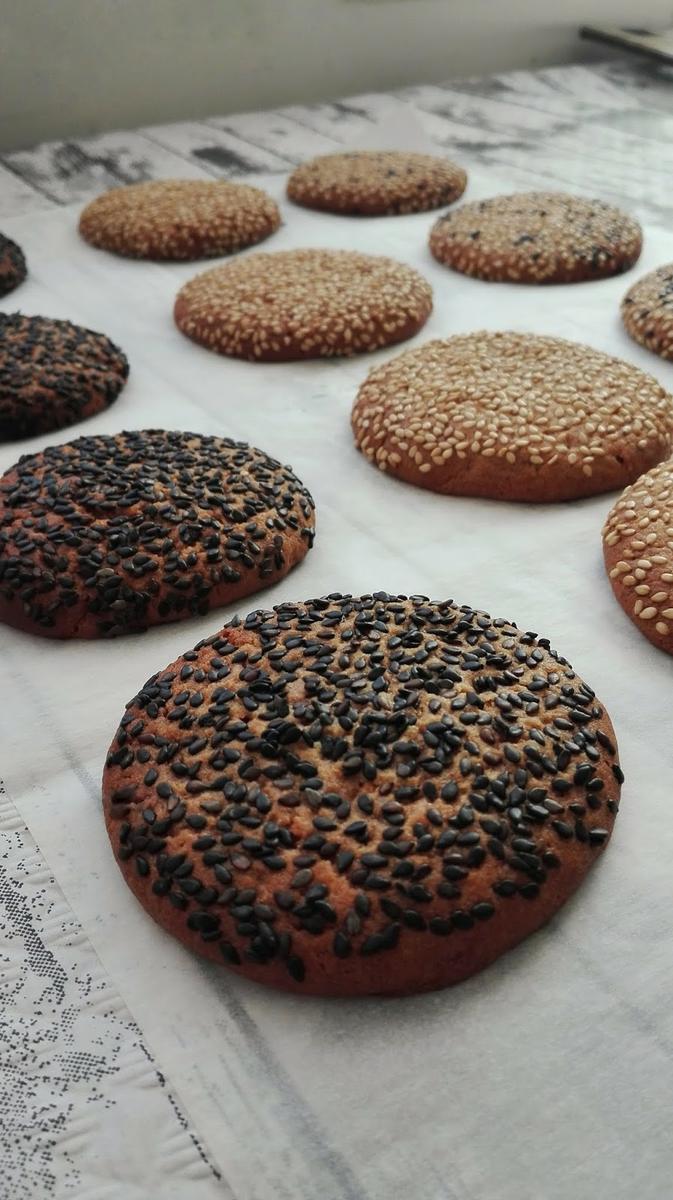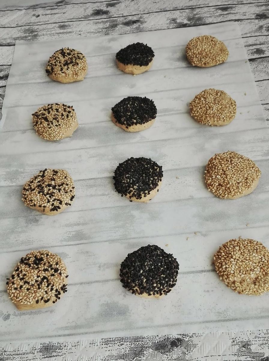 Sacamos, vamos cogiendo porciones de masa, redondeamos entre las manos y presionamos contra las semillas de sésamo.
