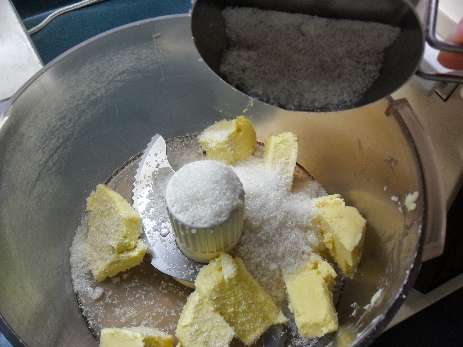· Mezcle en el procesador de alimentos, con batidora, o a mano con batidor de globo, la mantequilla, o margarina con el azúcar, hasta formar un arenado.