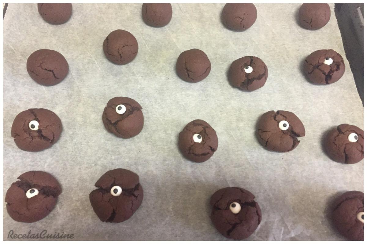 Si por el contrario no sois muy de celebrar esta fiesta, daos el capricho y prepararlas de todas formas, omitiendo poner los ojos de azúcar, e igualmente, os quedarán unas galletas tremendas, crujientes por fuera y blanditas en su interior, con un sabor a chocolate que las hace irresistibles.