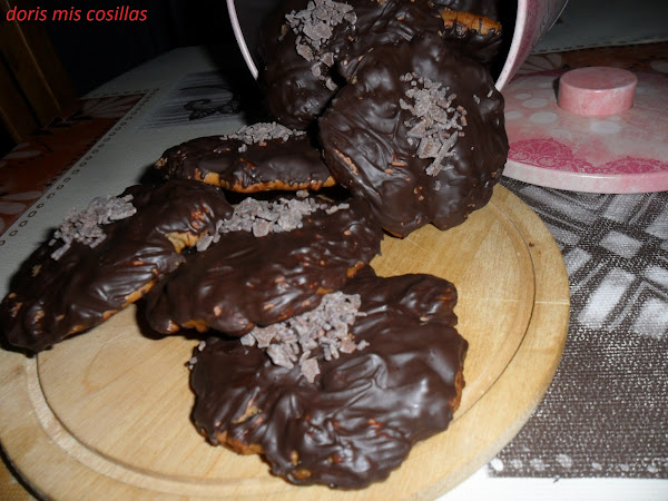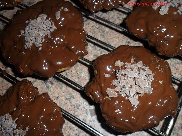 Cubrimos de chocolate por todas partes y agregamos unas escamas de chocolate con leche antes de que se seque.Dejamos enfriar sobre una rejilla y listo para degustarlas.
