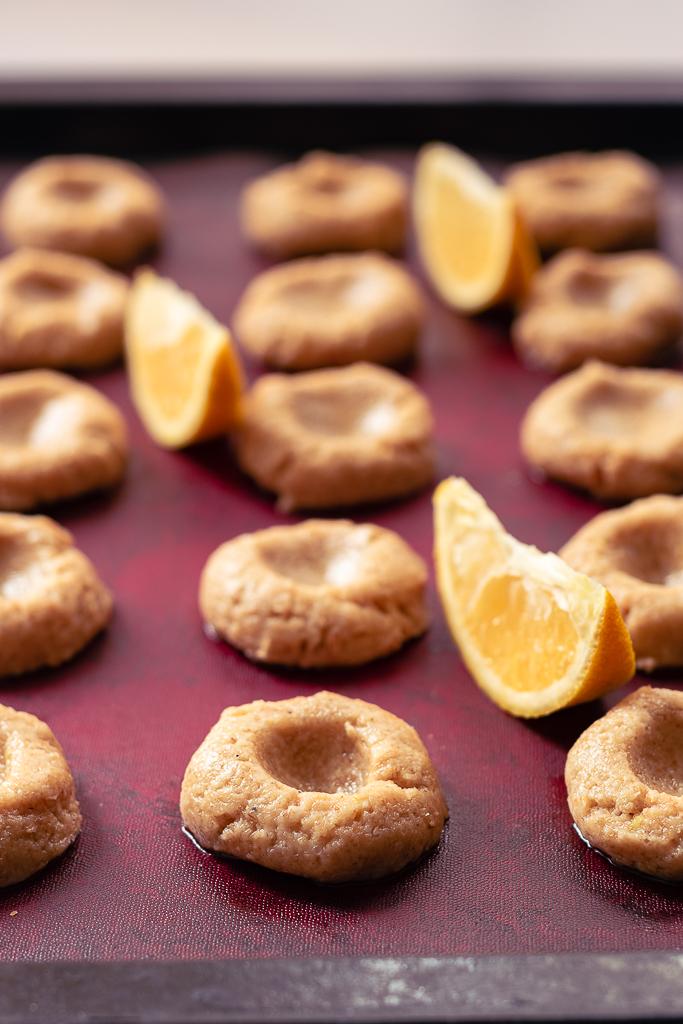 Una vez colocadas todas las bolitas de pasta sobre la bandeja; con una cucharita o algún objeto redondo; hundir el centro de la galleta para que se expanda la masa y se cree una concavidad en el centro. En esta concavidad pueden añadir algún fruto seco como almendras, merey o anacardo, o un trozo de dátil. Esto último es opcional.