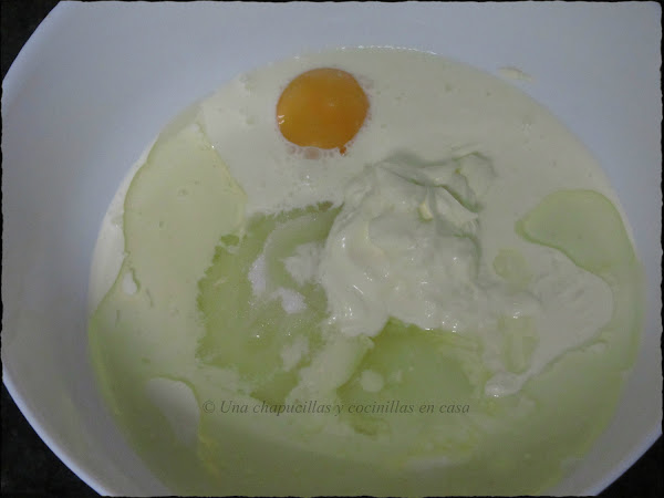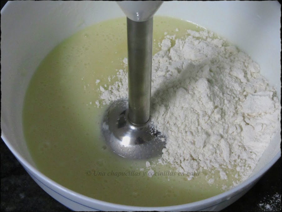 Mezclar en el bol todos los ingredientes excepto la harina y mezclar todo bien con ayuda de una batidora.