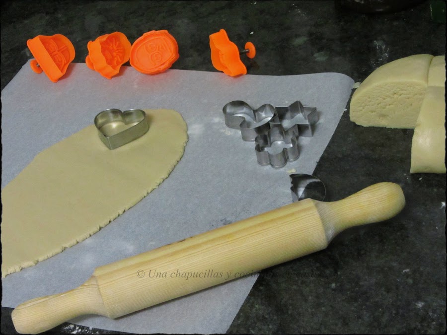 Formar una bola y dividirla en 4 partes. Amasar con ayuda de un rodillo sobre papel de horno al grosor deseado e ir cortando con cortapastas.
