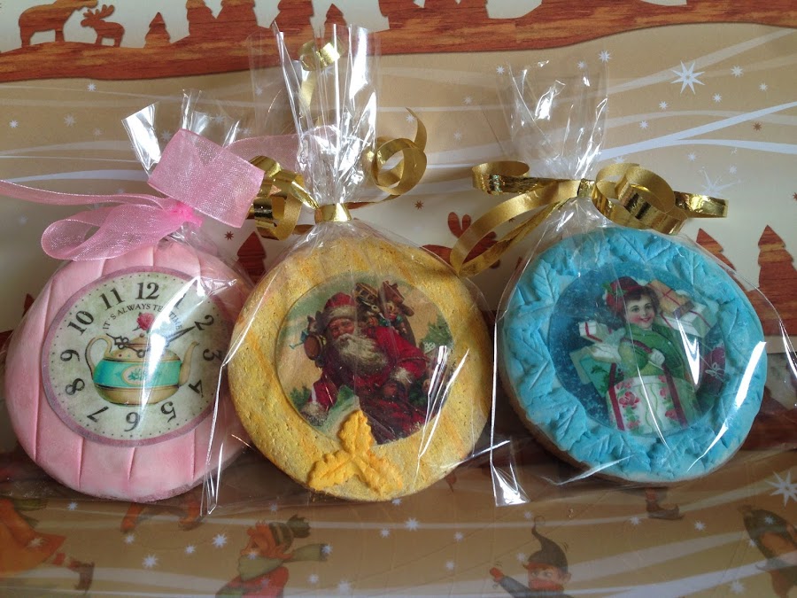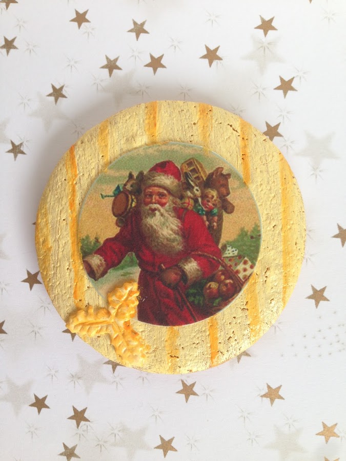 Para decorar esta galleta, mezclé un poco de colorante en gel de wilton amarillo dorado con colorante blanco de wilton y una pizca de vodka y pinté directamente la galleta, luego hice unas rayitas más finas verticales con el colorante en gel amarillo dorado y un pincelito más fino, pegué la imagen comestible con jarabe de maiz karo y le puse un detalle de hojas de acebo en fondant blanco, pintada con los mismos colorantes.