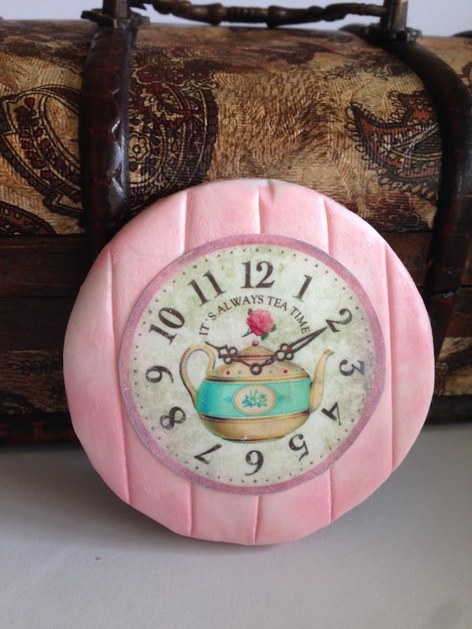 Y para terminar, este reloj vintage decorado con fondant blanco con rayas verticales y colorante rosa en polvo.