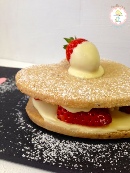 Para el relleno, derretiremos el chocolate en el microondas en intervalos cortitos con mucho cuidado de no quemarlo. Una vez lo tengamos, dejamos enfriar un poco (sobre todo para no quemarnos) ponemos un poco de relleno y las fresas contadas por la mitad, encima. Podemos terminar con un poco más de chocolate sobre estas para que la galleta que colocaremos encima quede mejor fijada. Lo podremos hacer con una manga o con una cucharita.