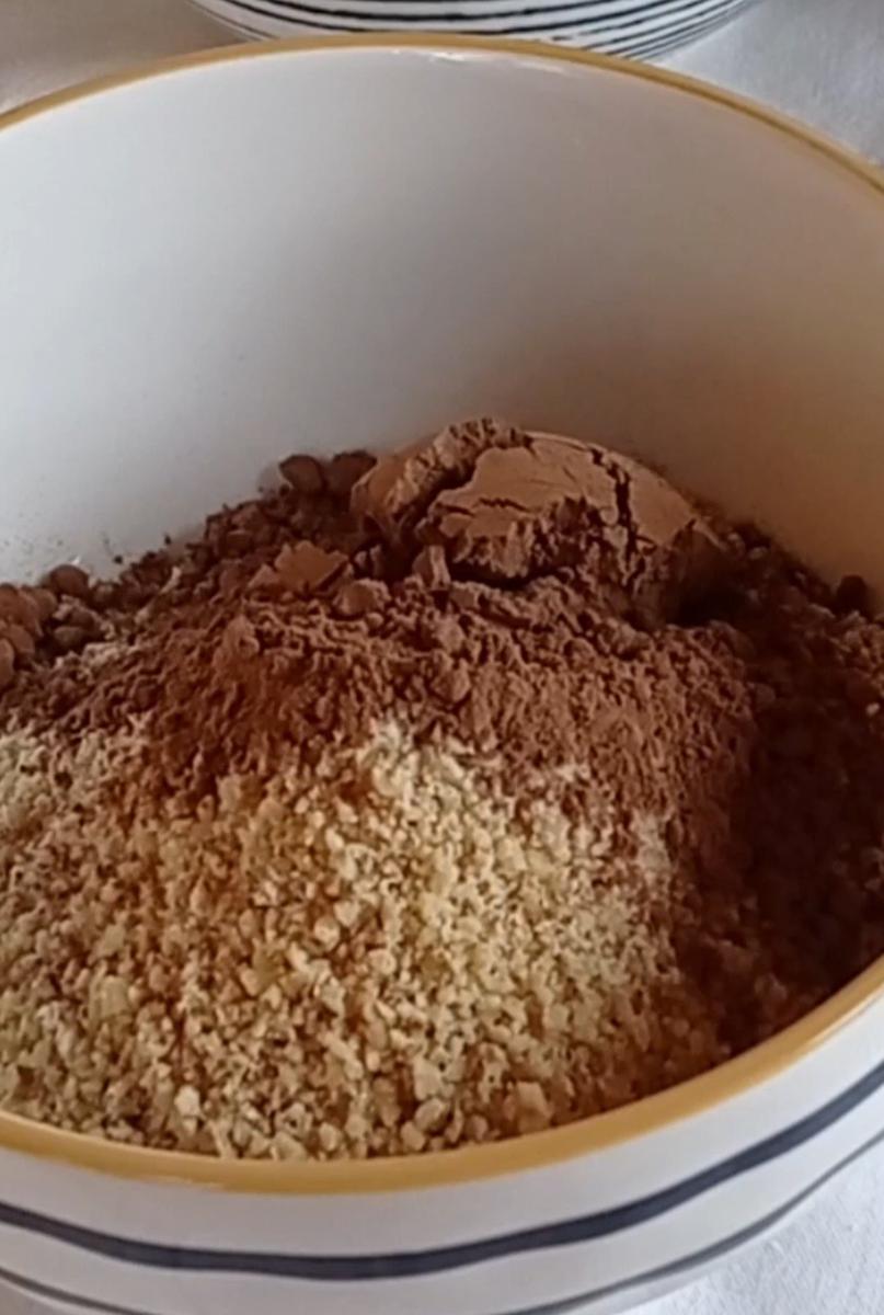 1-Mezclar las galletas molidas, con las nueces molidas, el cacao y la ganache, formar una pasta , si lo necesita la puedes llevar unos minutos a la heladera.