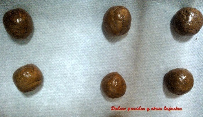 Hacemos unas bolitas de unos 2,5 cm de diámetro y las colocamos en la bandeja que habíamos preparado.