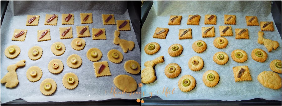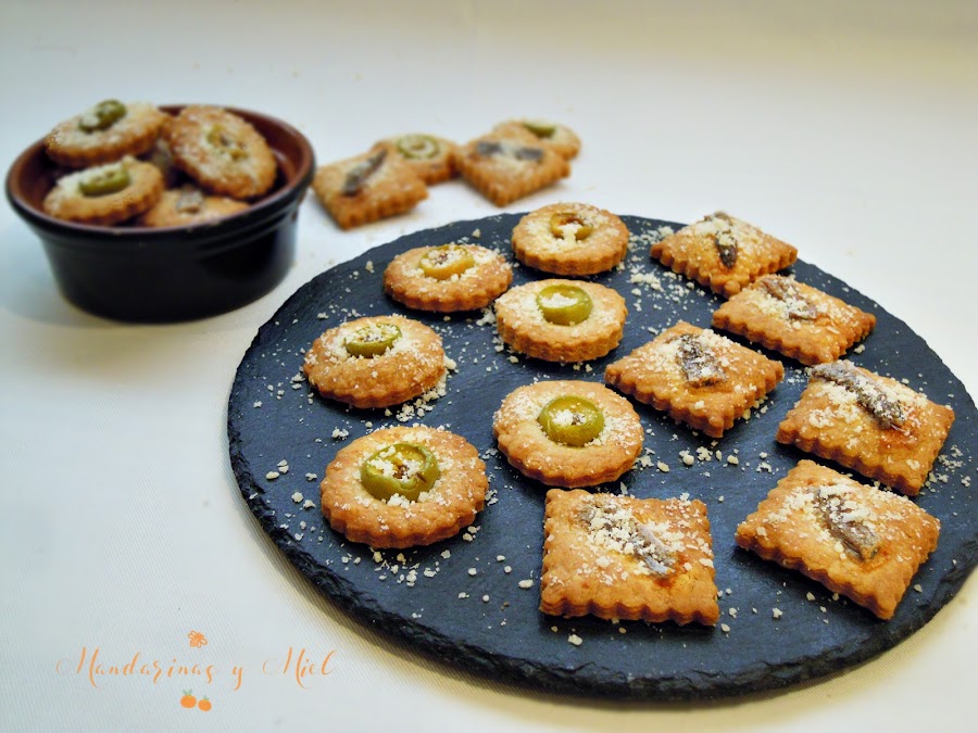 Coloca sobre algunas galletas unas aceitunas partidas en aritos y en otras un trocito de anchoa.